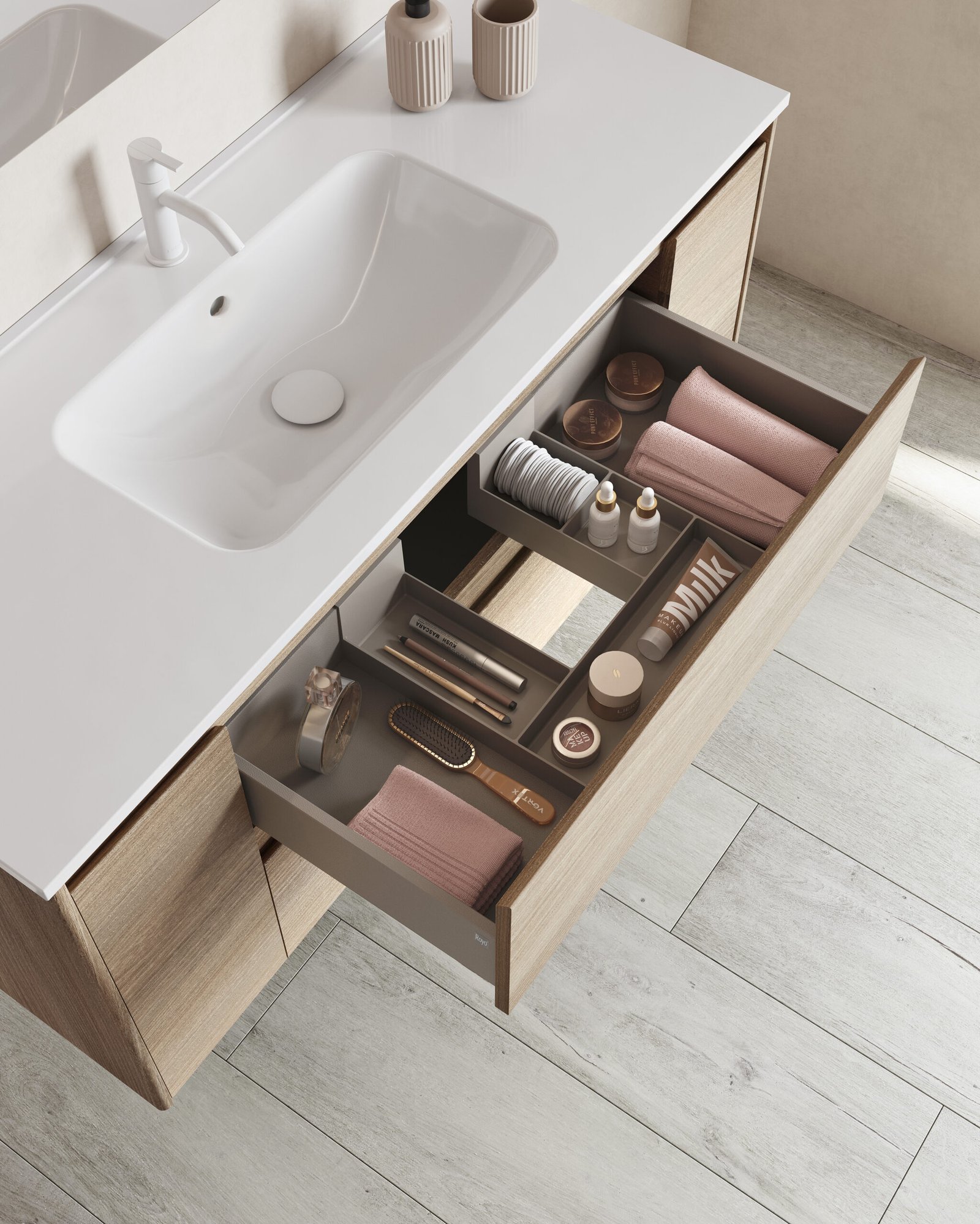 Més enllà del seu aspecte sofisticat, Alfa Compact brilla per la seva enorme funcionalitat i capacitat d’adaptació. Ofereix combinacions intel·ligents només de calaixos o estructures híbrides amb portes, ideals per a qualsevol necessitat d’emmagatzematge. Al seu interior, hi trobem tecnologia d’alta gamma: calaixos amb guies d’extracció total Hettich, un exclusiu revestiment fosc en acabat fumé cuir i un organitzador de sèrie. Tot això, amb la llibertat d’instal·lar-lo suspès o amb potes decoratives metàl·liques per a un aire més industrial.