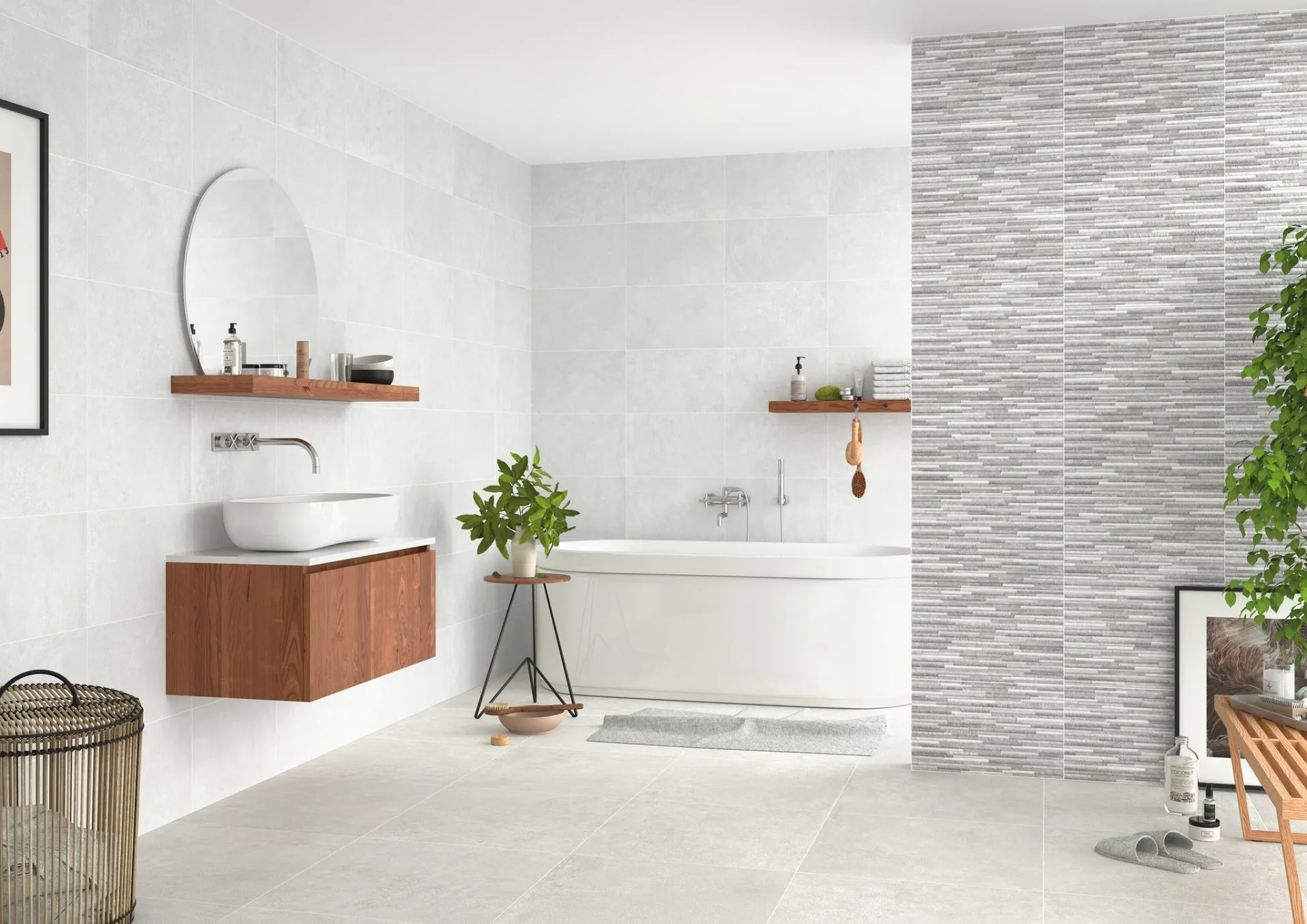 Amb un acabat mat que proporciona una superfície suau i lliure de reflexos, Ciron ofereix una paleta de colors suaus —Beige, Bone, Grey i White— que conviden a la serenitat. El toc de disseny el posen les peces decoratives Ciron Mosaic, disponibles en les variants Cold (per a les bases fredes com el Grey i White) i Warm (per a les bases càlides com el Beige i Bone). Aquests relleus geomètrics permeten trencar la monotonia visual i crear parets d’accent sofisticades i amb un subtil joc de volums.