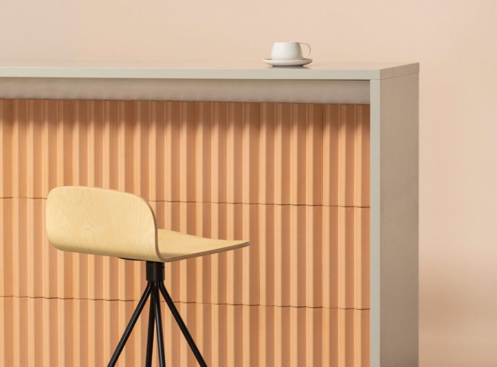 Concebut exclusivament per a la seva aplicació en murs i parets, aquest format modular aporta un volum subtil i rítmic a l’espai mitjançant la repetició de la seva geometria en ziga-zaga, creant un patró visualment ric i texturat.