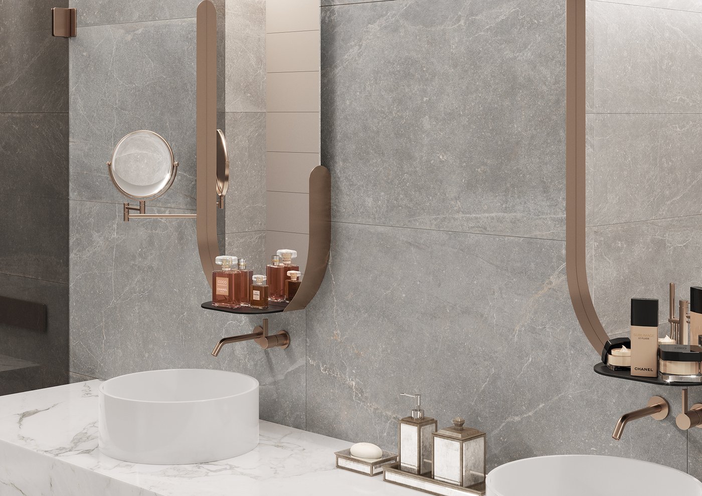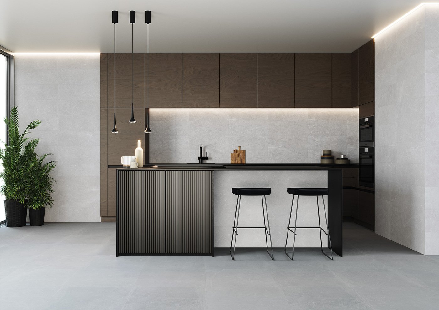 Material i Inspiració: Paviment i revestiment d’efecte ciment urbà i minimalista.