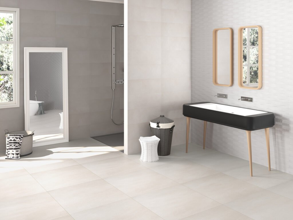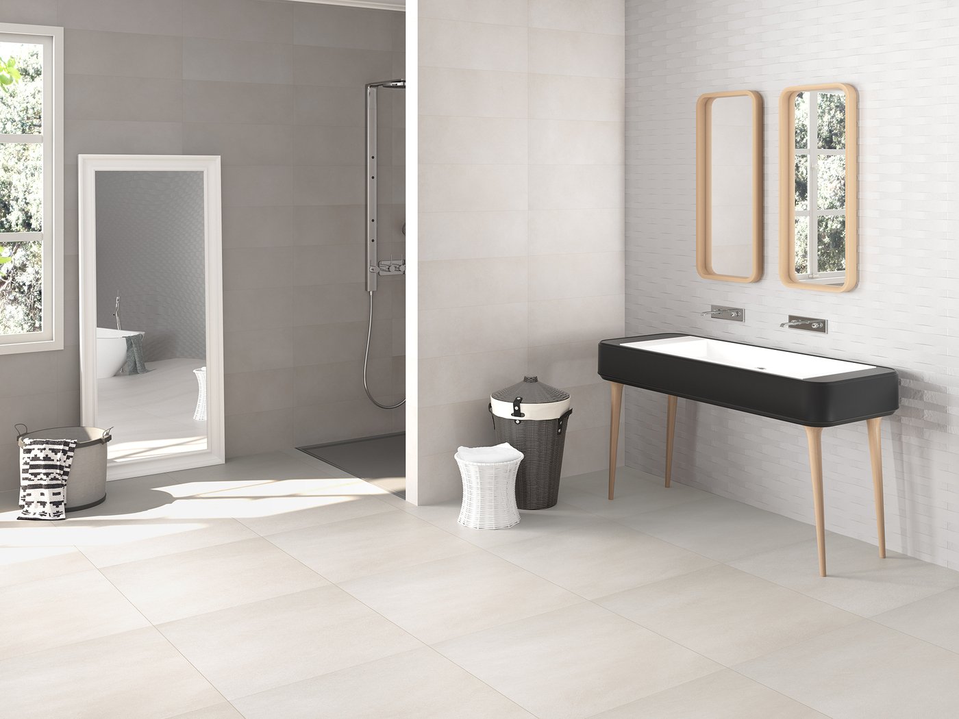 Material i Inspiració: Paviment d’efecte ciment suau i de línies contemporànies.