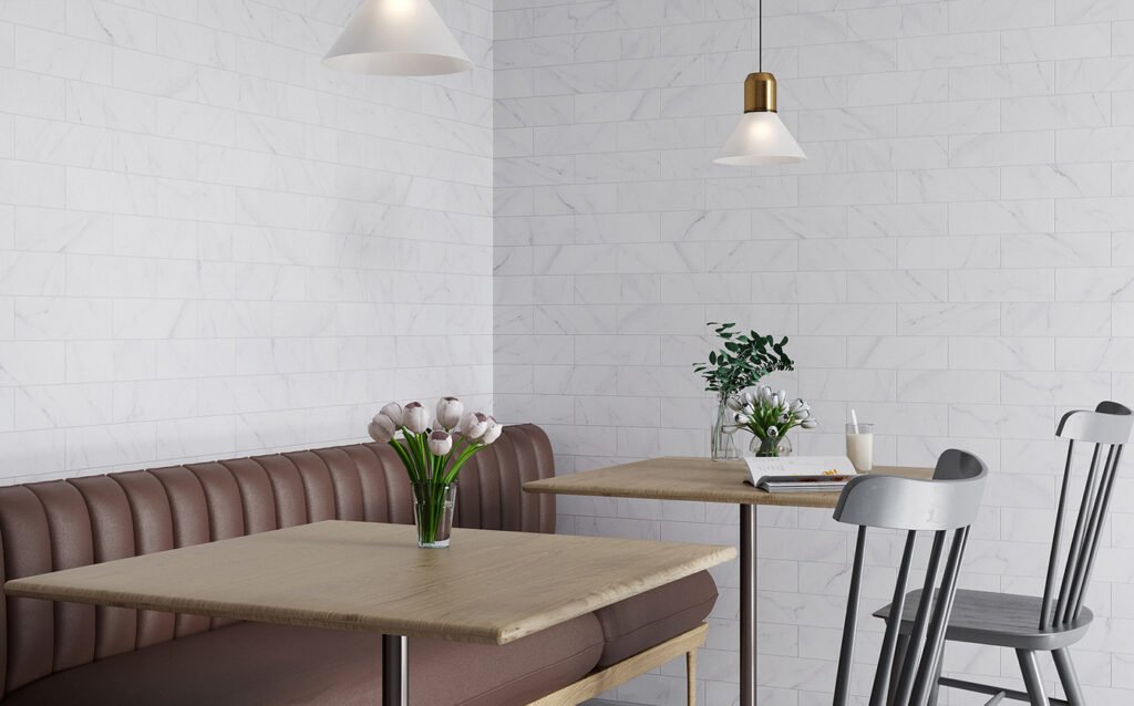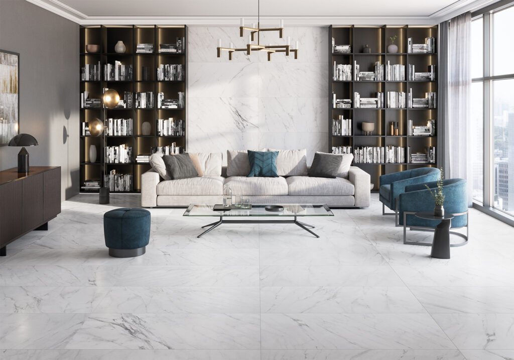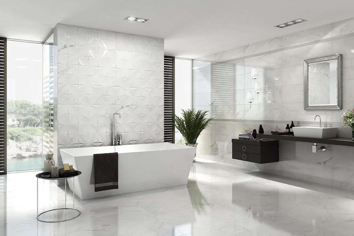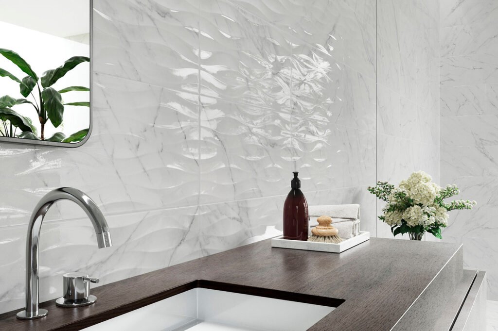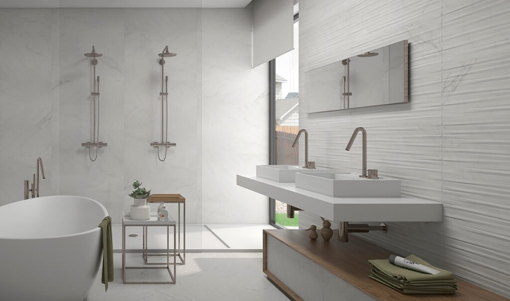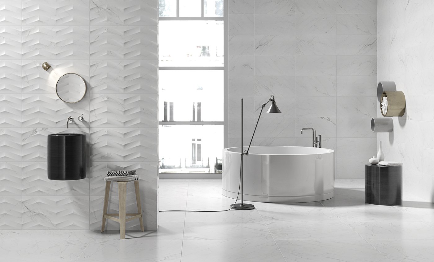Material i Inspiració: Paviment i Revestiment (inclou Pasta Blanca) d’efecte marbre blanc lluminós.