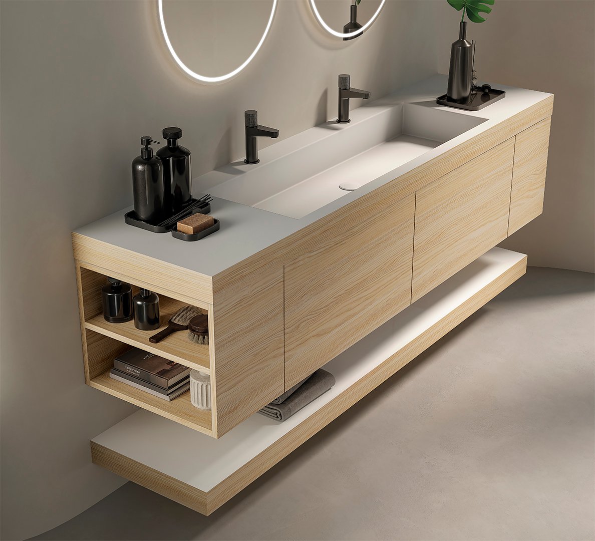 Per coronar aquesta estructura horitzontal impecable, Kyrya proposa un joc de volums mitjançant l’ús de l’encimera Durian (la referència del mercat en superfícies sòlides, de tacte sedós i de neteja fàcil). La zona d’aigües central integra a la perfecció la luxosa pica model Imperia, mentre que els laterals estan coberts per una prolongació de l’encimera llisa sota l’estilitzat disseny de vores Eclipse. Finalment, per aportar el toc atmosfèric definitiu, el conjunt es completa amb els elegants miralls Naya retroil·luminats i amb perímetre sorrejat.