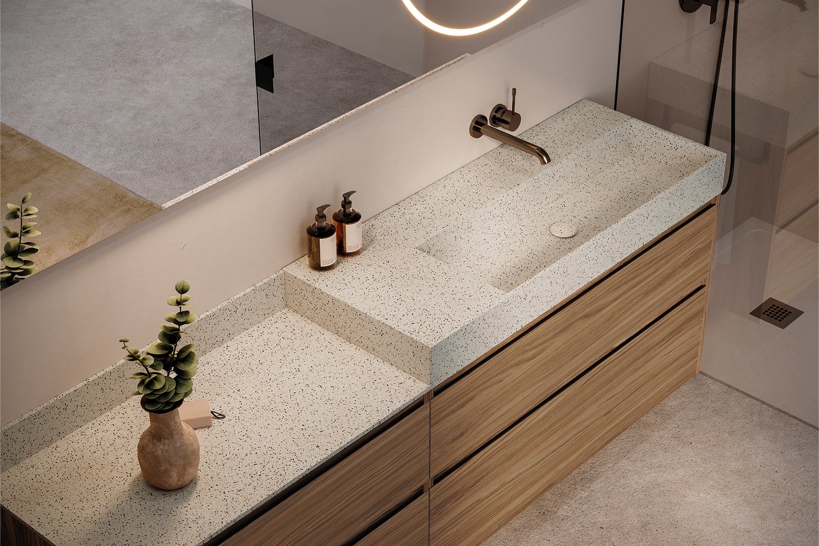 El veritable centre d’atenció d’aquesta composició és la resolució de la zona d’aigües mitjançant encimeres a doble alçada. Kyrya combina una imponent pica model Bari fabricada en el sedós material Durian (en acabat Dune càlid) amb una encimera auxiliar inferior que compta amb un sòcol anivellat exactament a l’alçada de la pica, creant un efecte de bloc continu fascinant. L’ambient es corona amb el mirall circular Halo, que emmarca el conjunt amb el seu subtil perímetre sorrejat, i es tanca a la perfecció amb el plat de dutxa Concept (Durian blanc amb detalls en acer inoxidable), aconseguint una harmonia absoluta.
