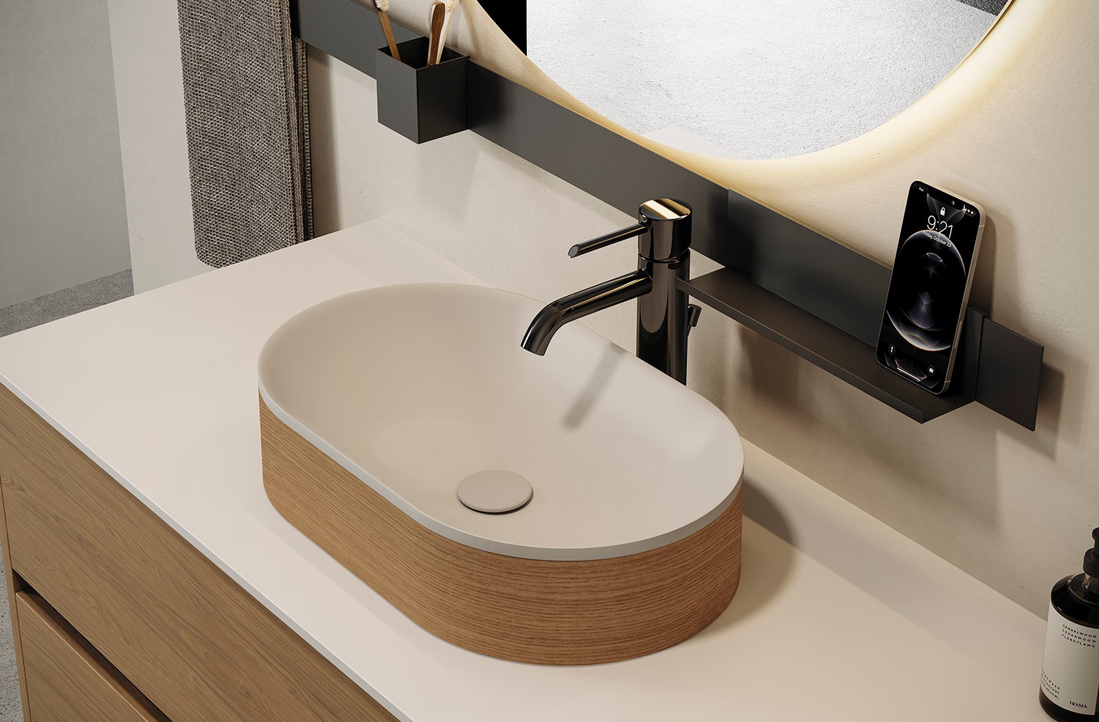 La composició modular K|507 de Kyrya transcendeix el concepte de bany tradicional per convertir-se en una experiència de wellness completa d’alta costura. Aquest projecte és la representació perfecta de com fusionar l’emmagatzematge de gran volum amb l’elegància orgànica. El cor d’aquesta composició és un majestuós moble de quatre calaixos revestit en fusta texturitzada Arlux Natural Querkus, una fusta clara i lluminosa que contrasta de meravella amb l’esvelt perfil negre del sistema d’obertura Gola, alliberant completament l’espai de tiradors frontals.