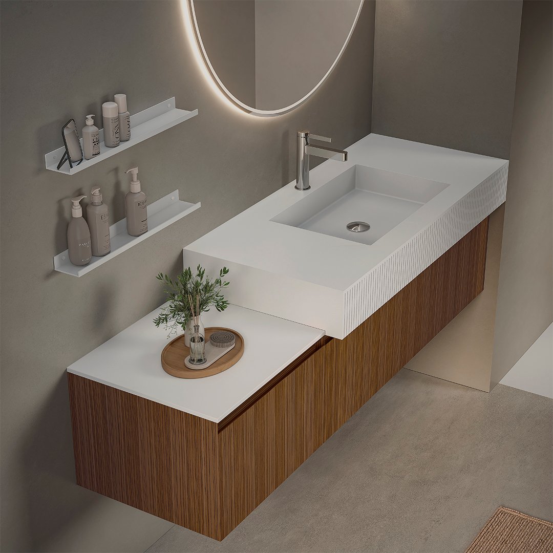 El contrast arquitectònic arriba de la mà de la zona d’aigües. Kyrya aposta per una espectacular encimera de Durian blanc pur que trenca la monotonia gràcies al seu faldó d’estètica Strip (estriada). Aquest detall texturitzat de línies verticals dialoga a la perfecció amb la veta de la fusta inferior, creant un joc de relleus fascinant. El conjunt es desdobla amb una segona encimera llisa contigua, flanquejada per uns pràctics i lleugers prestatges metàl·lics blancs fets a mida. La composició s’il·lumina atmosfèricament amb el mirall Glow, afegint el toc final de relax i amplitud a aquest oasi personal.