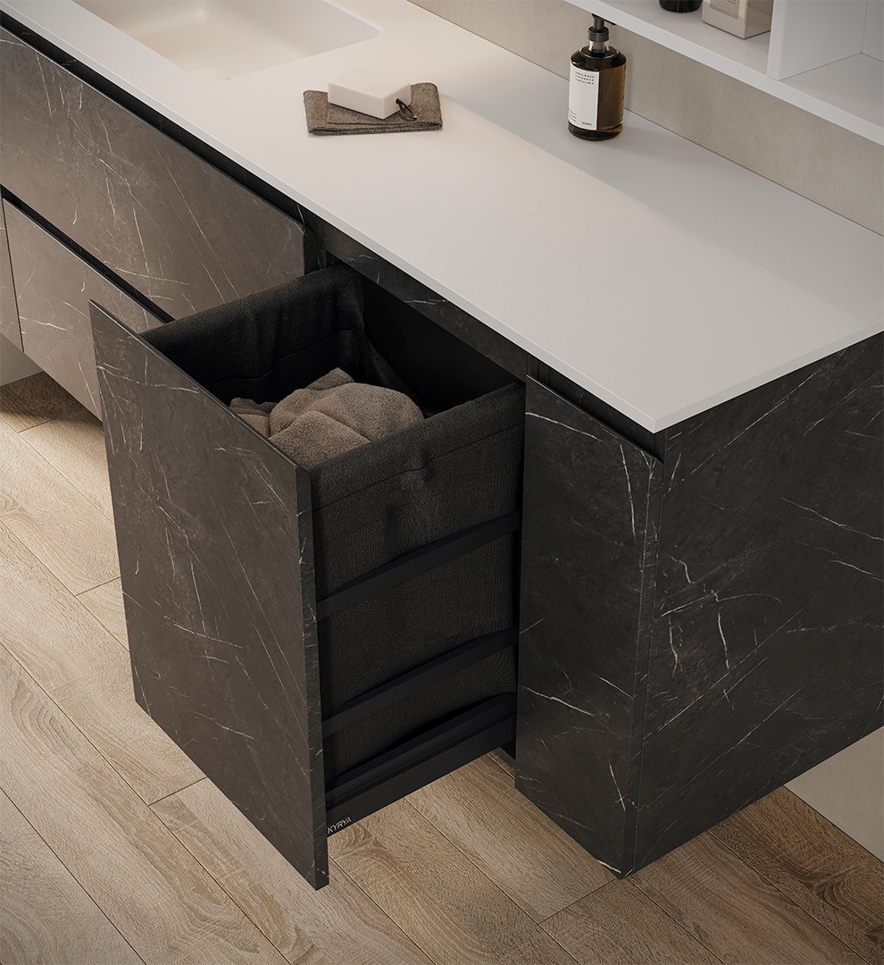 La composició modular K|512 de Kyrya demostra que el luxe i la màxima funcionalitat poden anar perfectament de la mà. Aquest disseny és una solució magistral per a banys que requereixen un alt nivell d’organització sense sacrificar l’estètica d’alta costura. El gran atractiu visual del conjunt és, sens dubte, el seu revestiment: un espectacular acabat Fantasy Marquina Rough que emula a la perfecció les profundes vetes blanques i la textura natural del marbre negre Marquina. Aquesta rotunditat estètica no es veu interrompuda en cap moment gràcies a un mecanisme d’obertura integrat amb biaix de 45 graus.