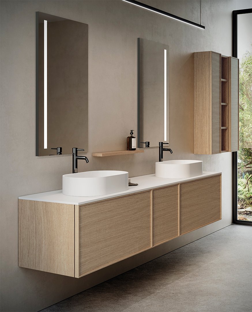 La zona d’aigües està concebuda com un santuari de netedat gràcies a l’encimera llisa de Durian blanc pur, sobre la qual s’alcen majestuosament les piques de posar model Enna, creant un joc de volums i textures de pur luxe. La capacitat d’emmagatzematge es multiplica de manera intel·ligent amb mòduls alts d’una porta i prestatgeries obertes en el mateix acabat de roure. Tot i això, el que converteix la K|513 en una peça d’interiorisme d’alta costura és la seva acurada il·luminació atmosfèrica: els miralls Ray (amb les seves elegants franges laterals) es complementen amb una impressionant lluminària feta a mida que s’enfila fins al sostre, banyant l’estança amb una llum suau, arquitectònica i totalment envoltant.