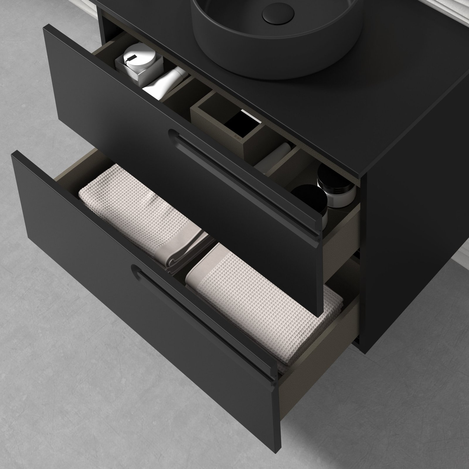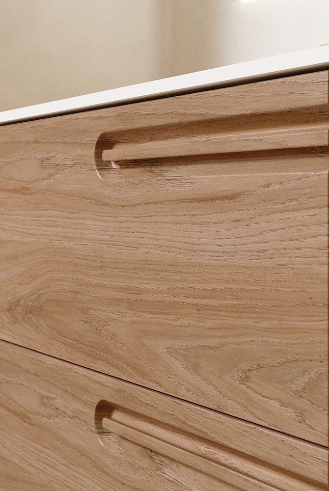 Més enllà de la seva captivadora estètica corba, aquest model és un prodigi de la tècnica i la sostenibilitat. Els seus acabats estan realitzats mitjançant un innovador i respectuós procés de lacat a l’aigua. Al seu interior, l’excel·lència es manté gràcies a l’ús de guies metàl·liques Hettich d’extracció total, que asseguren un lliscament perfecte, i un sofisticat revestiment interior en to fumé cuir que aporta un extra de luxe cada vegada que s’obre un calaix.