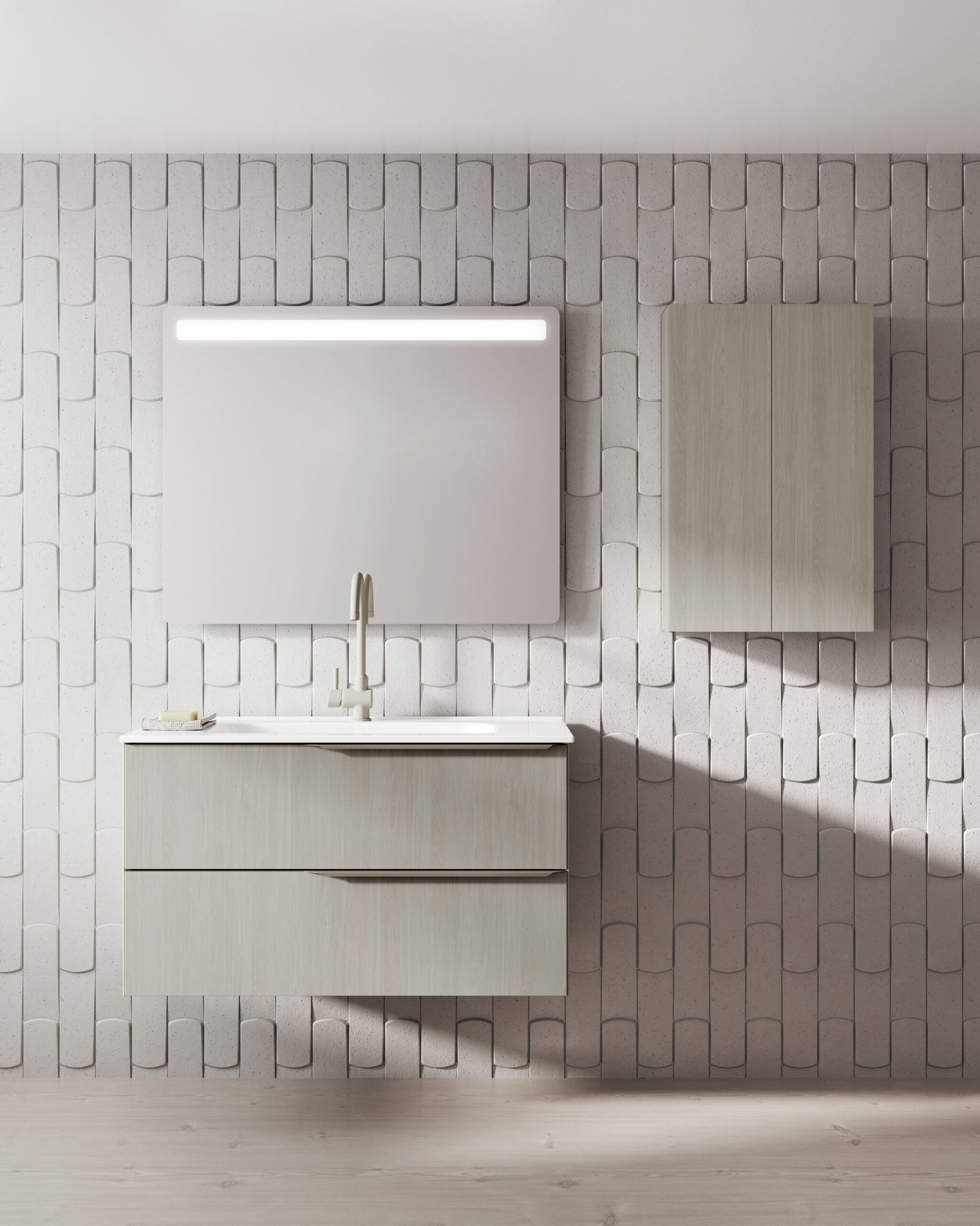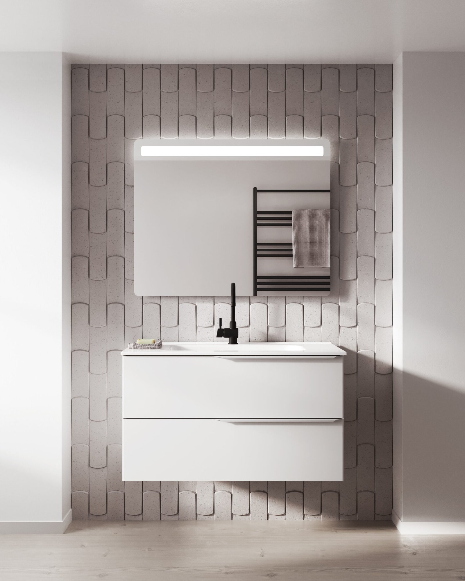 La col·lecció Mio Compact de Royo Group és l’aposta perfecta per als amants de l’estètica sòbria, elegant i de línies arquitectòniques rectes. Aquesta sèrie fuig dels excessos per centrar-se en la puresa visual, destacant per la seva gran personalitat, la qual s’aconsegueix a través d’un característic tirador amb un tall a biaix (inglet). Aquest detall geomètric no només resulta summament ergonòmic per a l’obertura diària, sinó que aporta un toc distintiu i d’alta fusteria al frontal del moble.