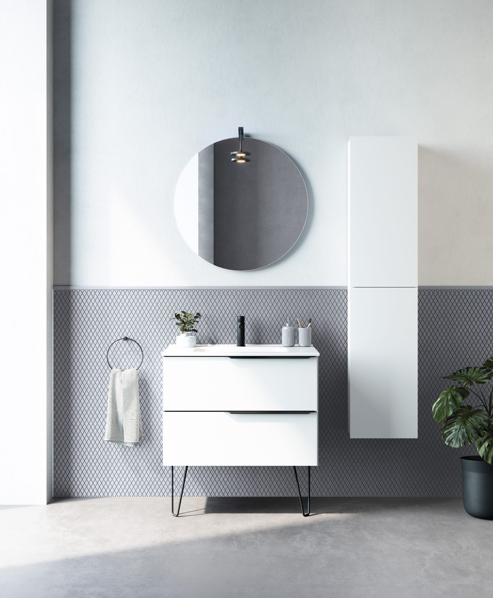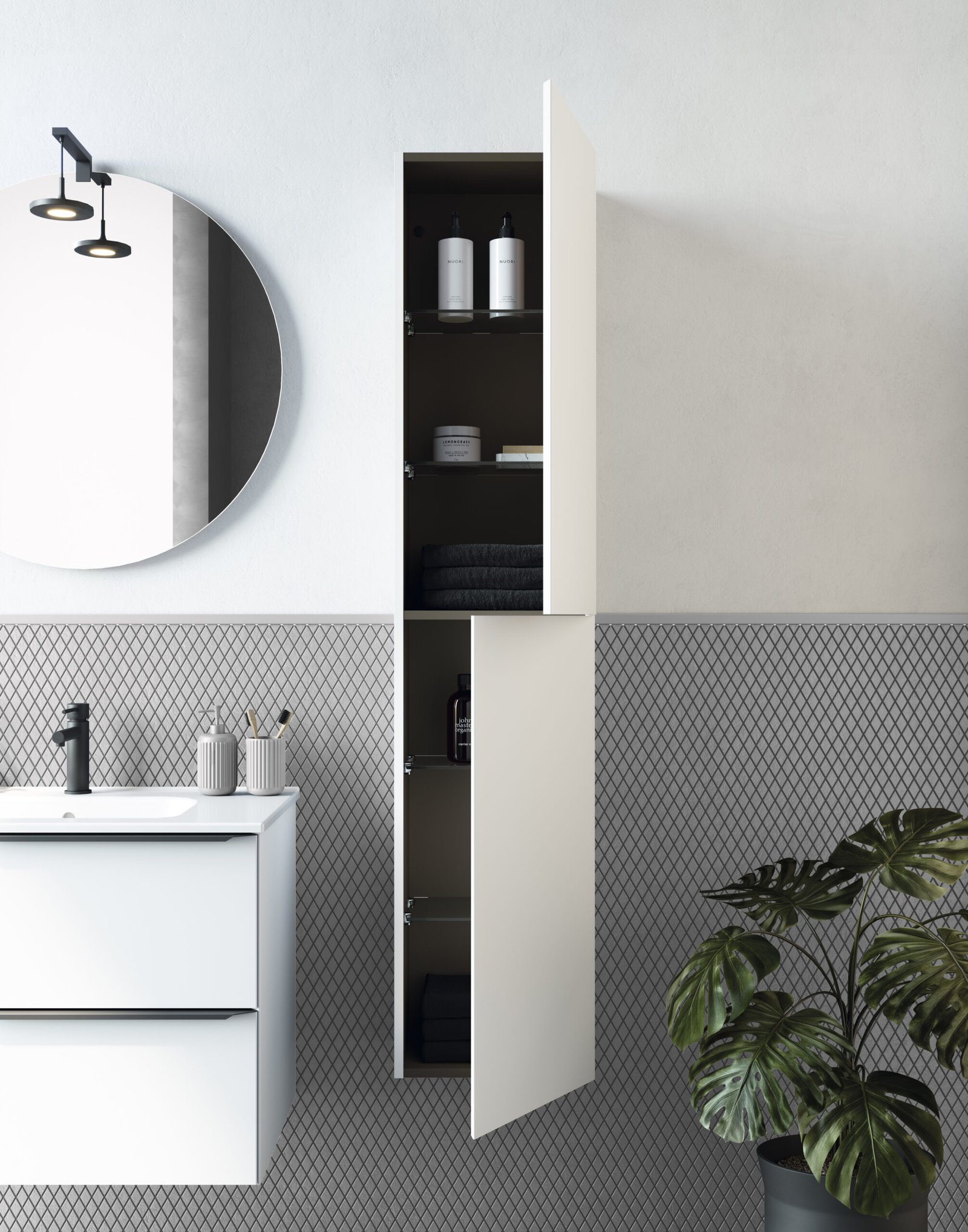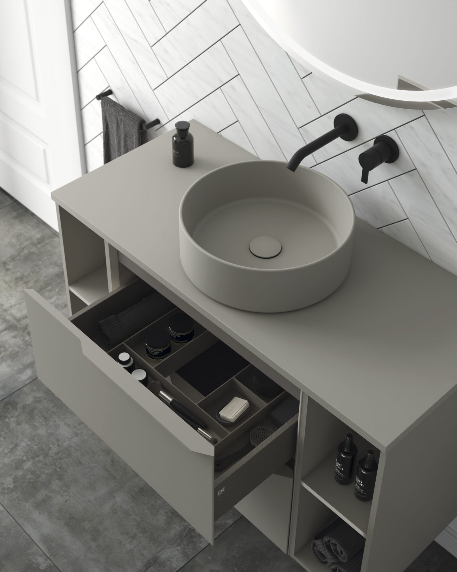 Completant la seva impecable façana, Mio Compact ofereix una experiència prèmium cada vegada que l’utilitzes. Al seu interior, la qualitat està garantida gràcies als calaixos equipats amb guies d’extracció total Hettich, un luxós i exclusiu revestiment fosc en acabat fumé cuir, i un pràctic organitzador de sèrie. A més, ofereix la llibertat d’accentuar el seu caràcter instal·lant-lo de forma suspesa o afegint-hi elegants potes metàl·liques decoratives per a un look més industrial.