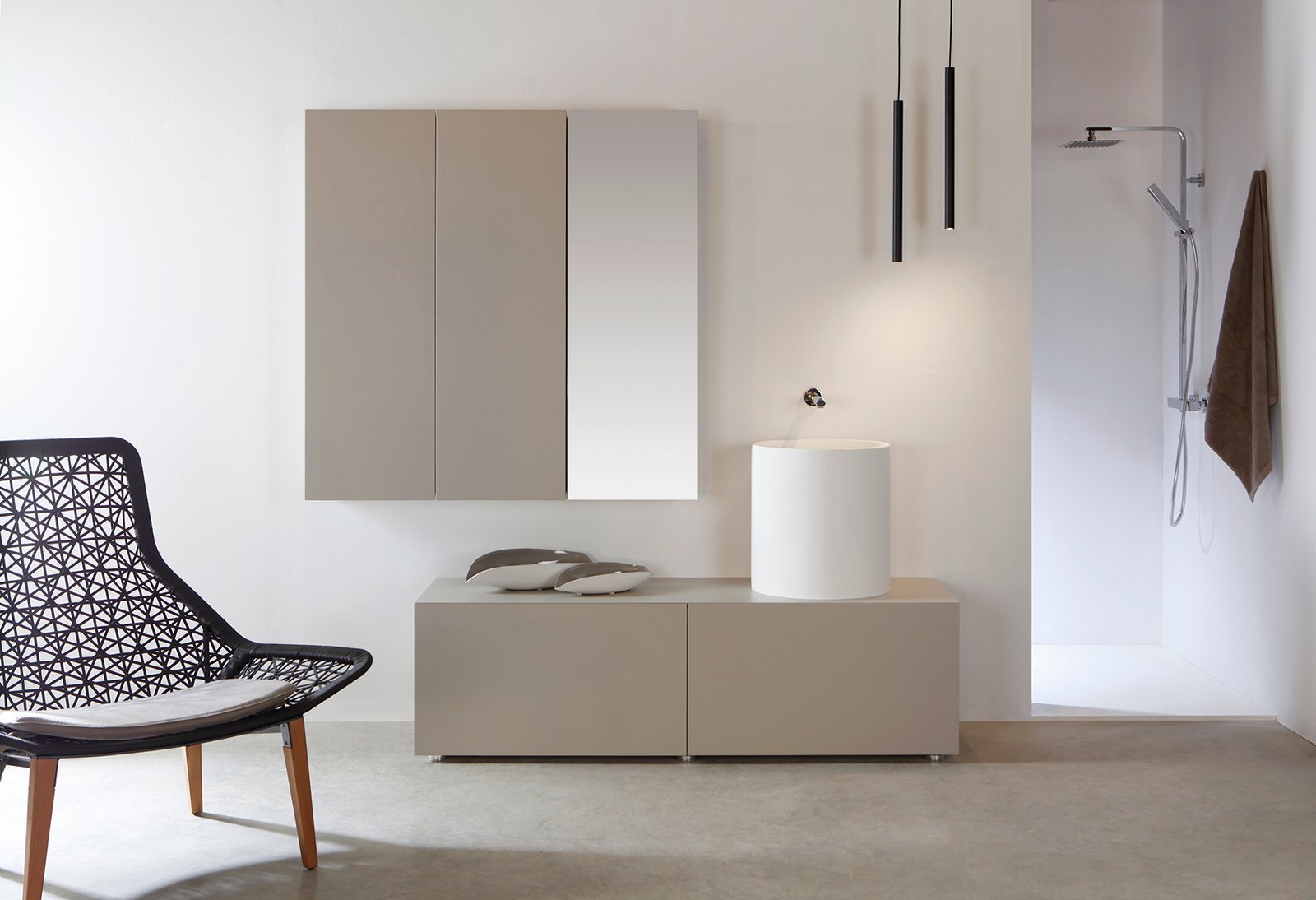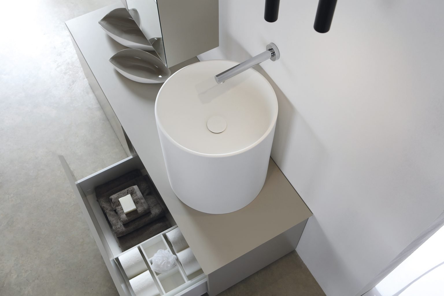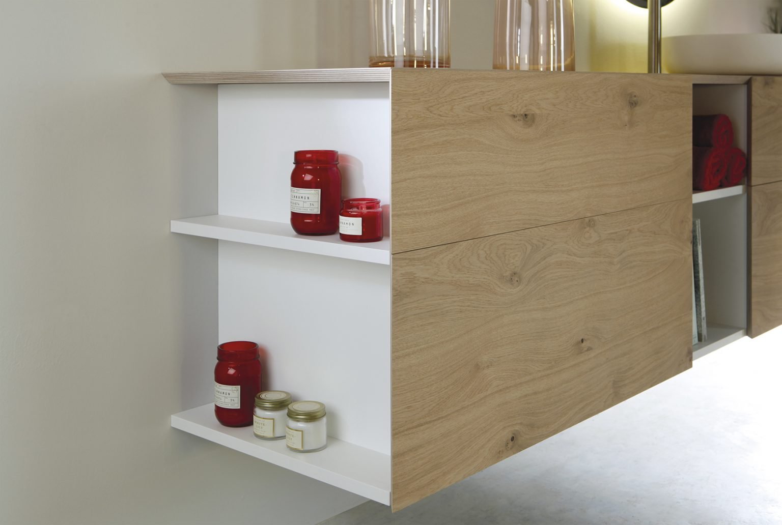 El tret distintiu de la sèrie Ockham és la unió de l’encimera amb el moble mitjançant un tall a inglet (45 graus), creant un efecte de bloc continu de gran valor estètic. Igual que el model Mola, l’obertura es realitza de manera còmoda pel lateral. Aquest disseny estratègic permet integrar accessoris d’ús diari —com toallers d’acer inoxidable o prestatges oberts— exclusivament als laterals, mantenint-los completament ocults des de la vista frontal i optimitzant l’espai sense trencar el minimalisme de la composició.