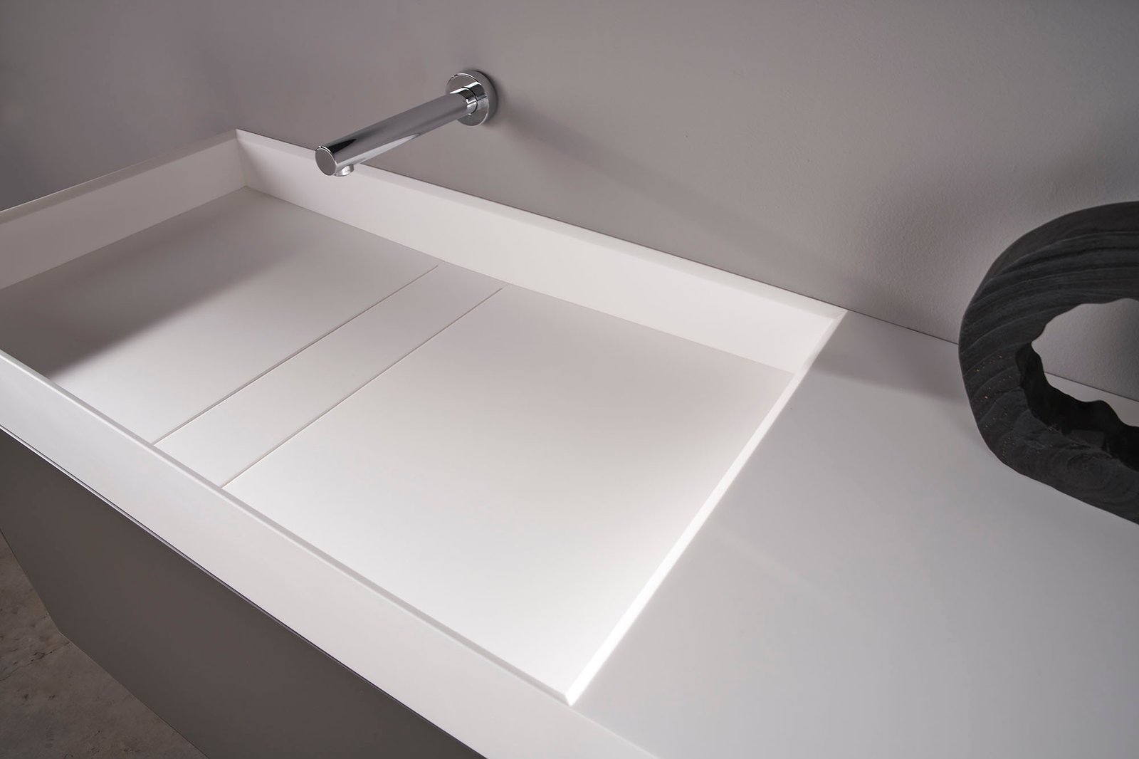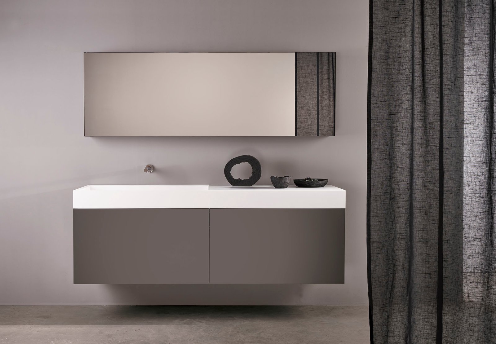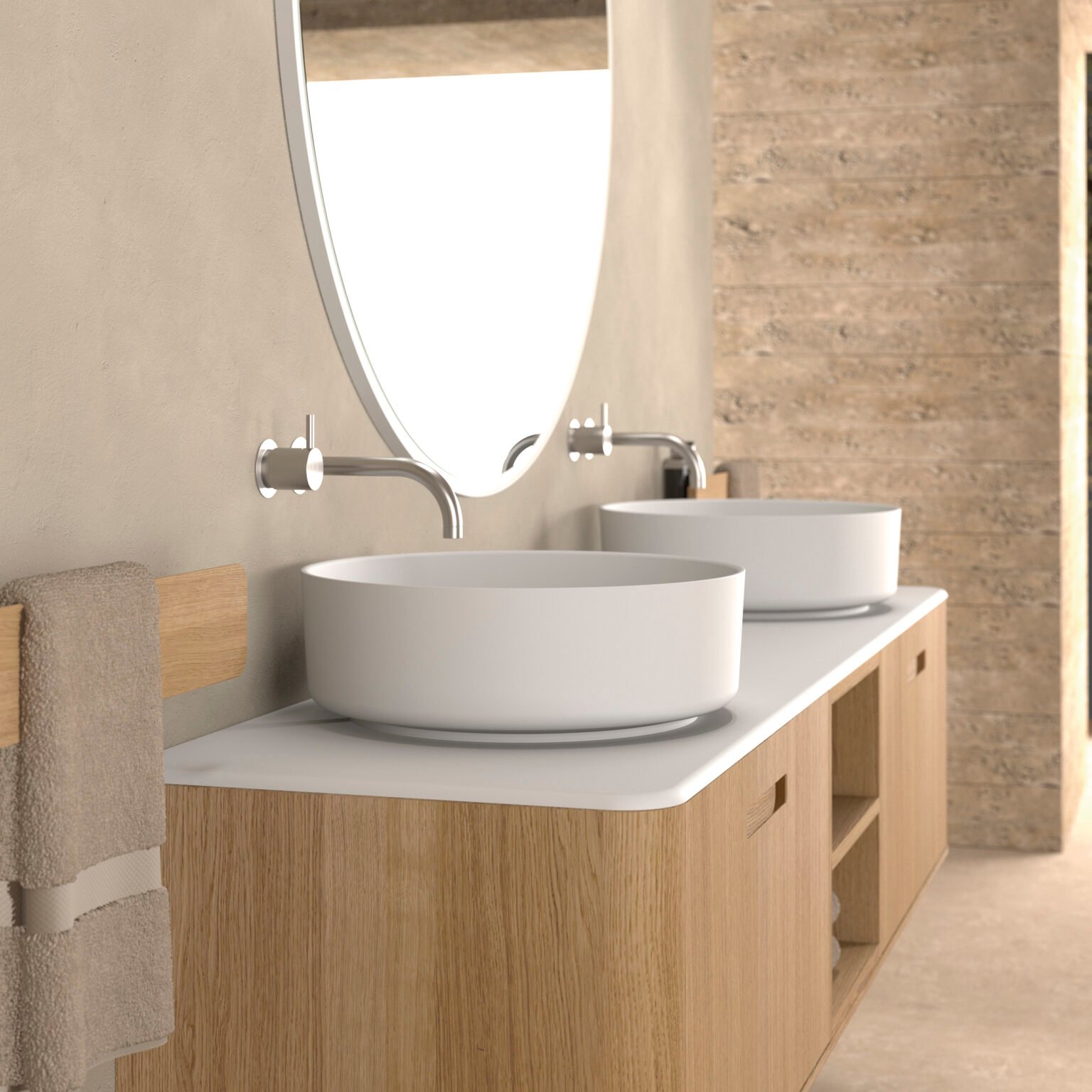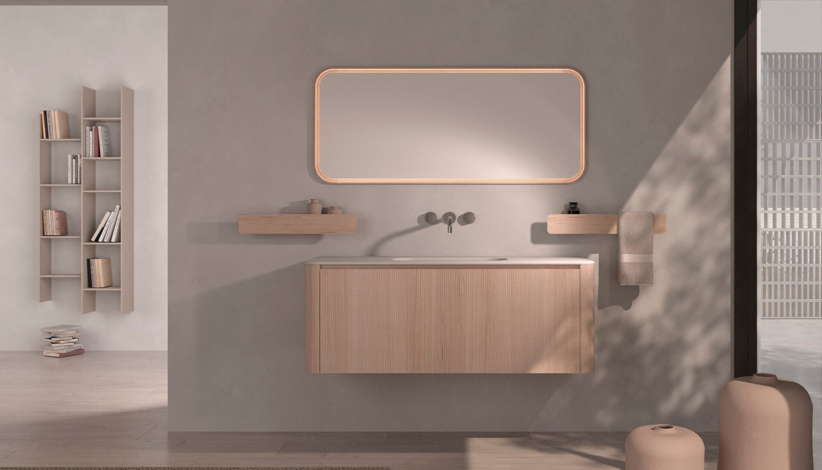 L’excel·lència de la sèrie Randa Flat també es troba a l’interior: l’ús de tauler marí de bedoll en els acabats de fusta garanteix una resistència estructural i a la humitat immillorable. Aquest material tècnic permet aplicar un fresat elegant (ranurat) on només s’aprecia la fusta noble. Pel que fa a les dimensions, permet crear configuracions equilibrades de dos cossos per a mides superiors a 120 cm i integrar el lavabo “Deia”, una peça d’estètica minimalista i cantells fins que s’uneix de manera gairebé imperceptible amb l’encimera.