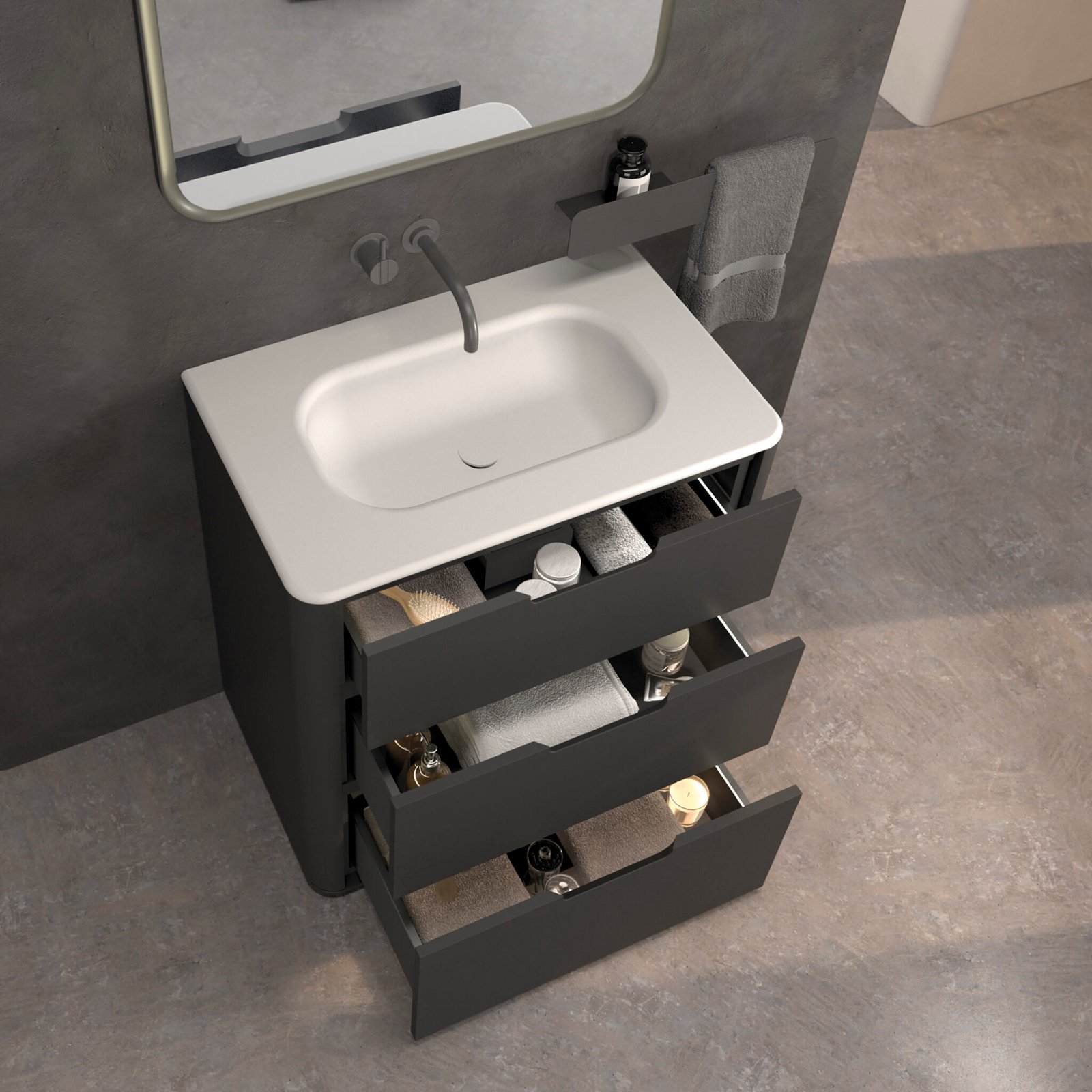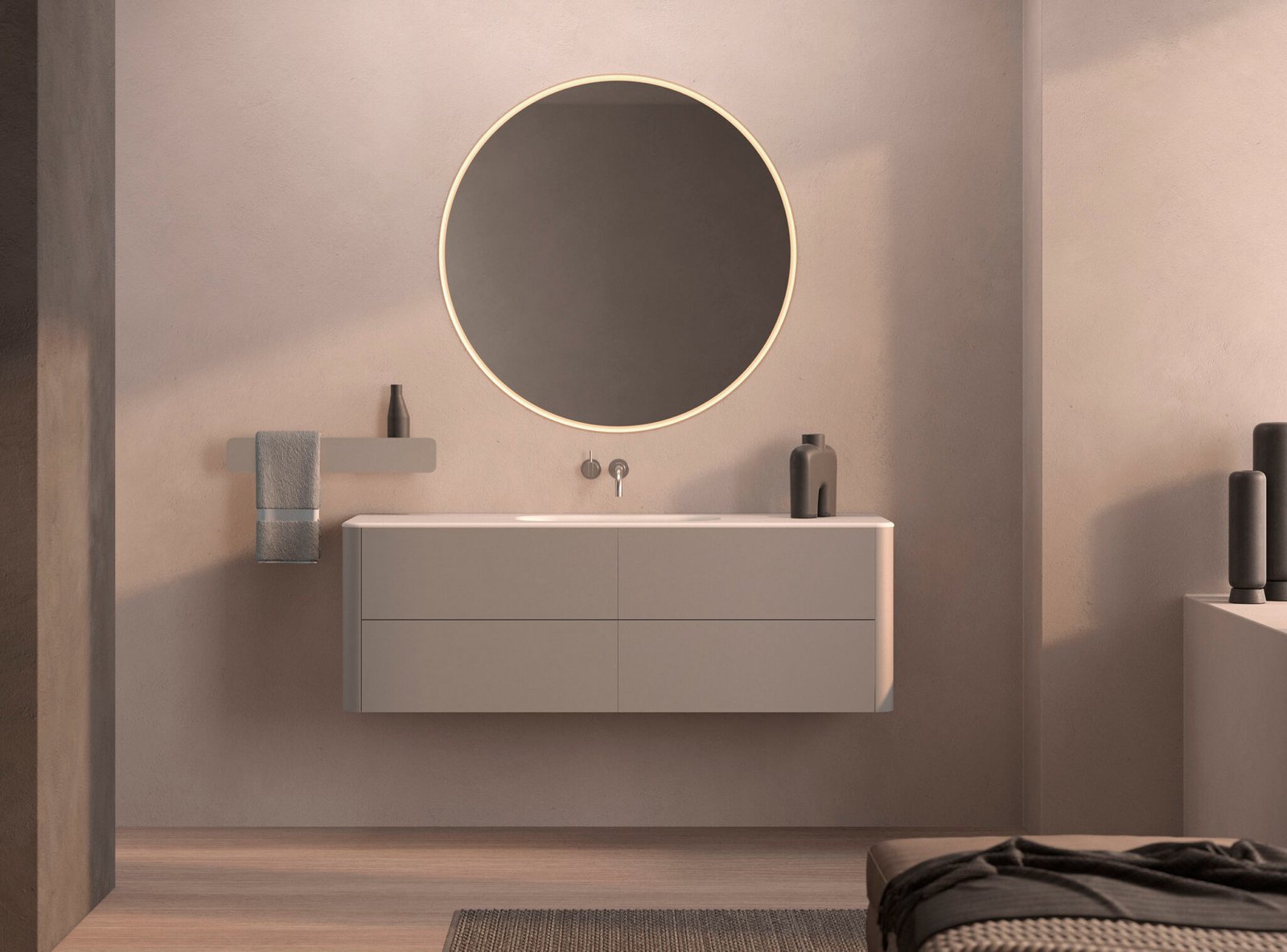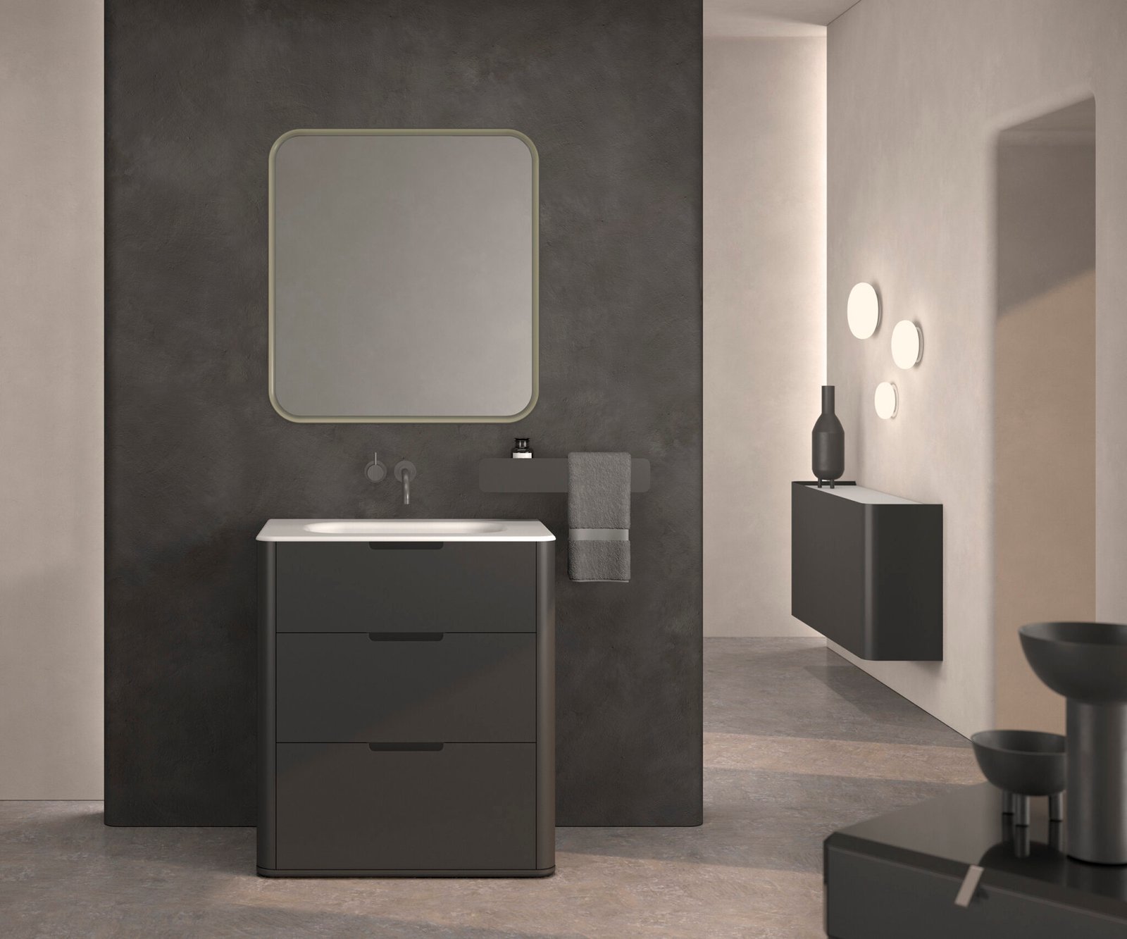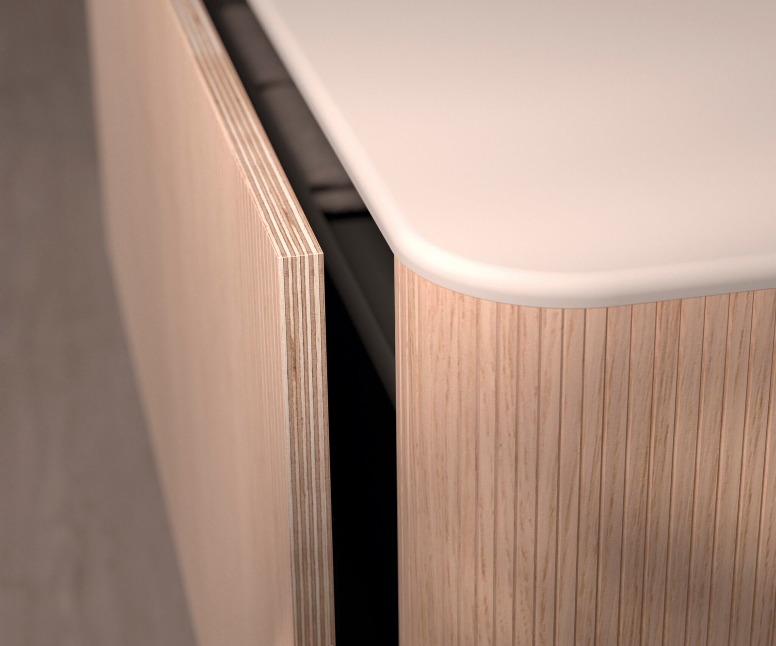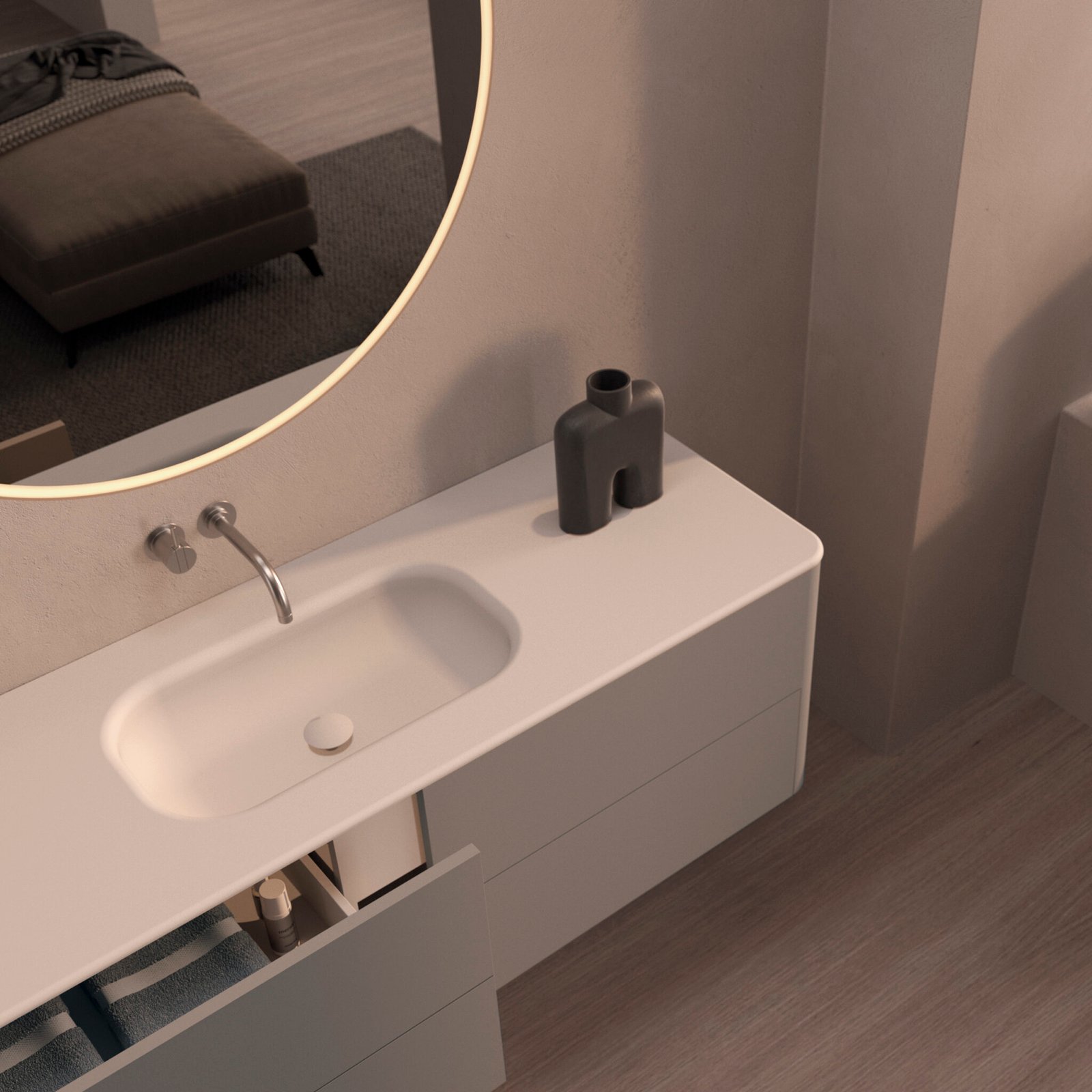 Per a aquells projectes que busquen línies més orgàniques, la sèrie ofereix els nous laterals Rounded que, combinats amb encimeres de línies arrodonides, eliminen els cantells agressius i aporten una estètica amable i serena. Aquesta fluïdesa s’accentua amb el nou tirador integrat “Suau”, un disseny totalment ergonòmic que elimina elements afegits al frontal, ressaltant la puresa geomètrica del moble i facilitant la neteja diària.