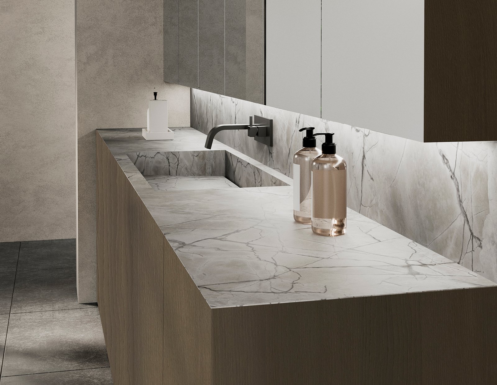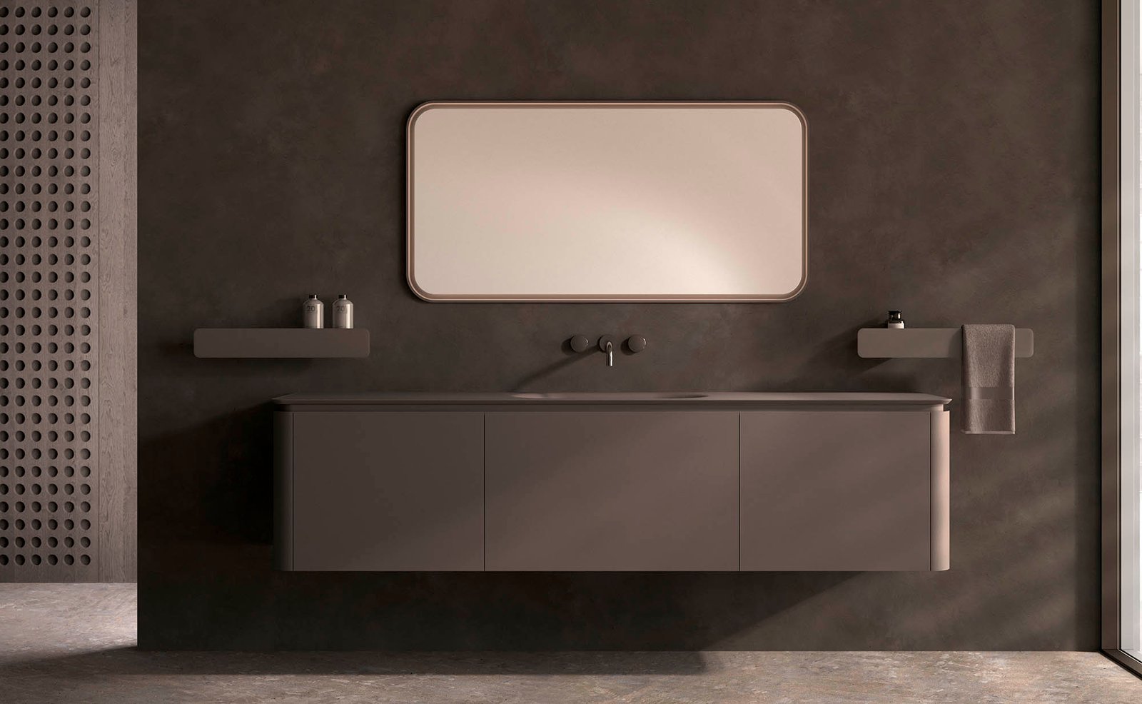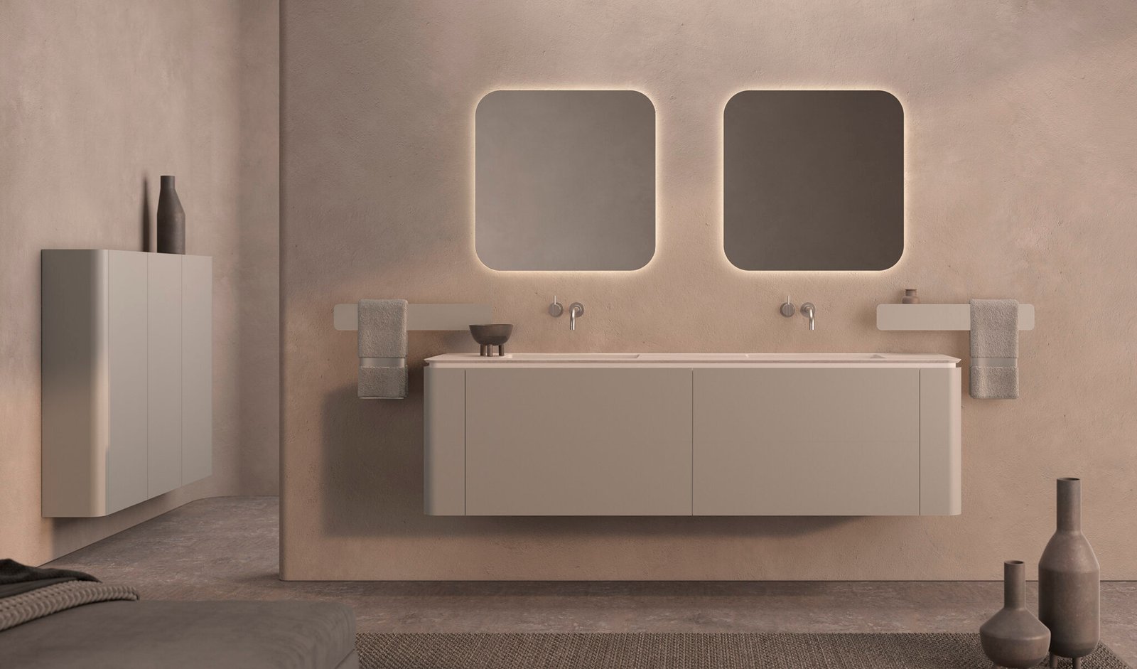 Inspirant-se en l’antiga col·lecció Sand, el Randa Miter incorpora un nou llenguatge formal on l’elevació i la suavitat de les corbes s’uneixen a la practicitat d’una obertura còmoda mitjançant ungler. L’encimera es pot fabricar en múltiples materials d’alta gamma, destacant l’HPL Compacte. Aquest material tècnic, extremadament resistent a la humitat i l’abrasió, està disponible en acabats marbre, fusta i Fenix anti-empremtes, permetent integrar piques sota encimera o de sobretaula. També admet combinacions amb cristall, resina i marbre natural.
