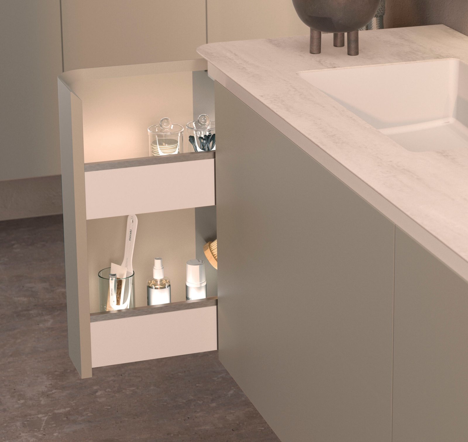 Més enllà de la seva impressionant estètica exterior, el Randa Miter brilla per la seva funcionalitat interna. Aquest model ofereix l’opció d’incorporar una calaixera lateral interna, un contenidor ideal de dos nivells dissenyat per mantenir perfectament ordenats els petits elements d’ús diari, amb la possibilitat d’afegir il·luminació interior per a una experiència d’ús prèmium.
