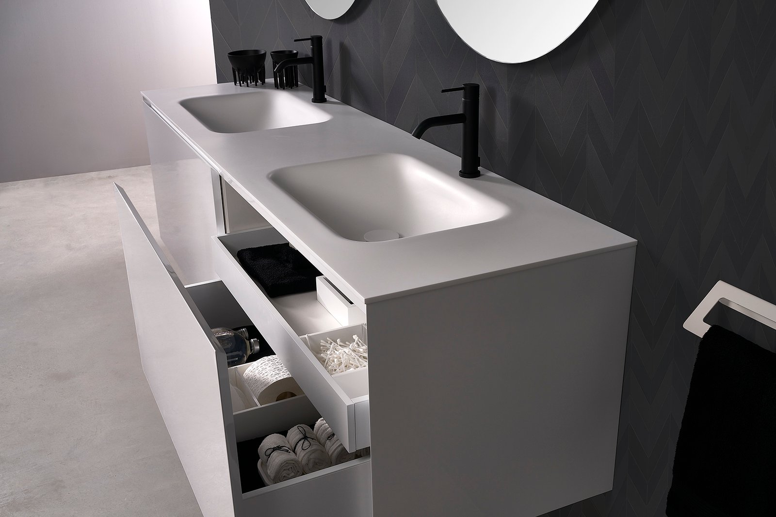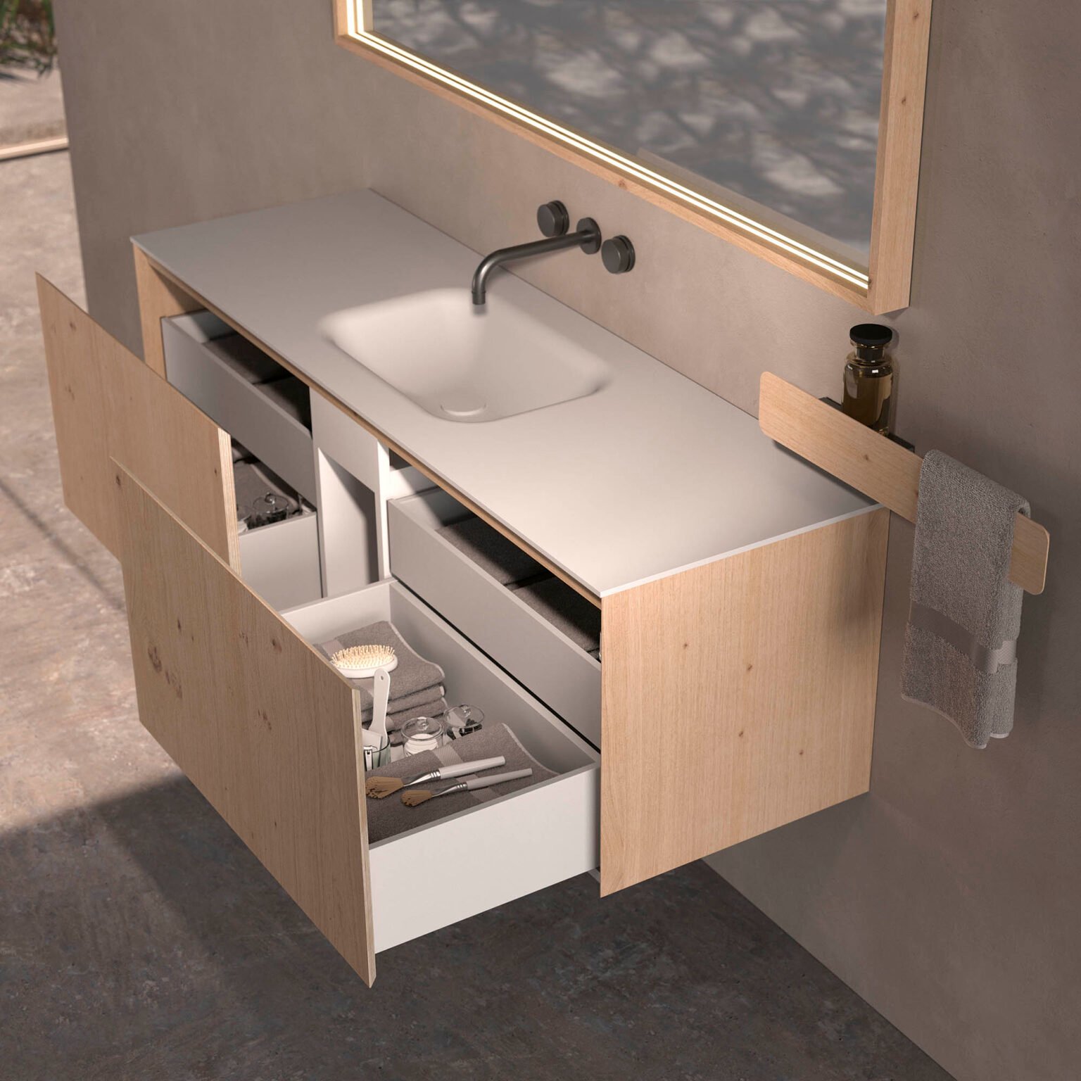L’aparent simplicitat del Randa Top amaga unes opcions de personalització extraordinàries. El moble inclou de sèrie una encimera de resina blanca i permet incorporar el lavabo en posició central, la qual cosa equilibra l’estètica i optimitza l’espai d’emmagatzematge interior. Està disponible en amplades que van des dels 60 fins als 180 centímetres, amb 83 acabats exteriors, 4 acabats interiors, 4 models de lavabo, opció de calaixos interiors addicionals i preparació per a aixetes murals o de repisa.