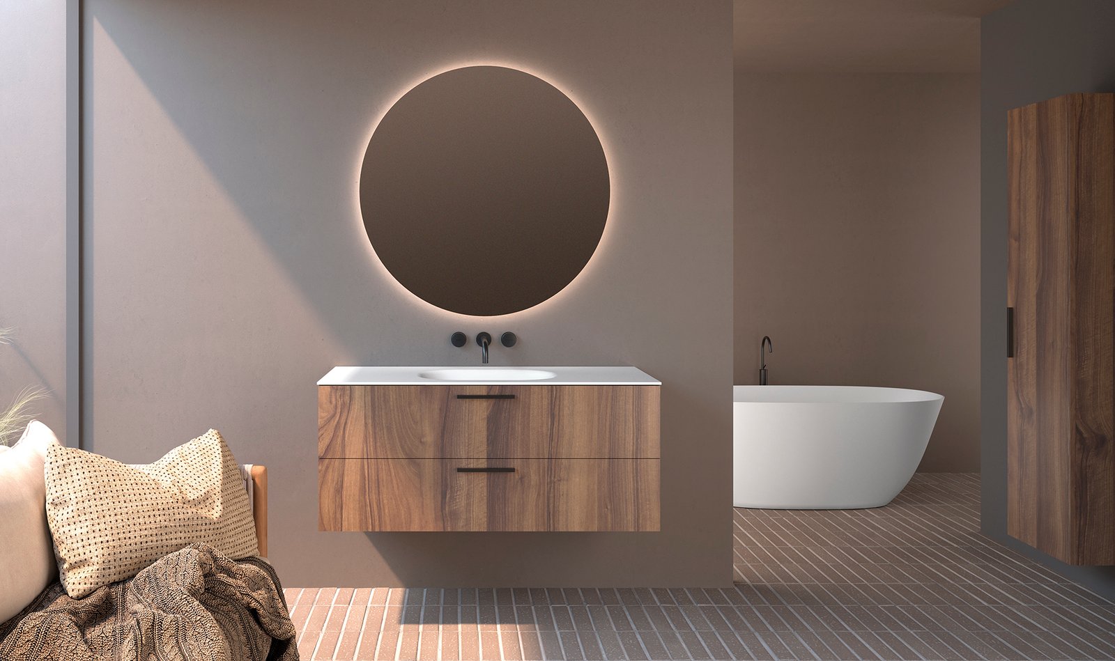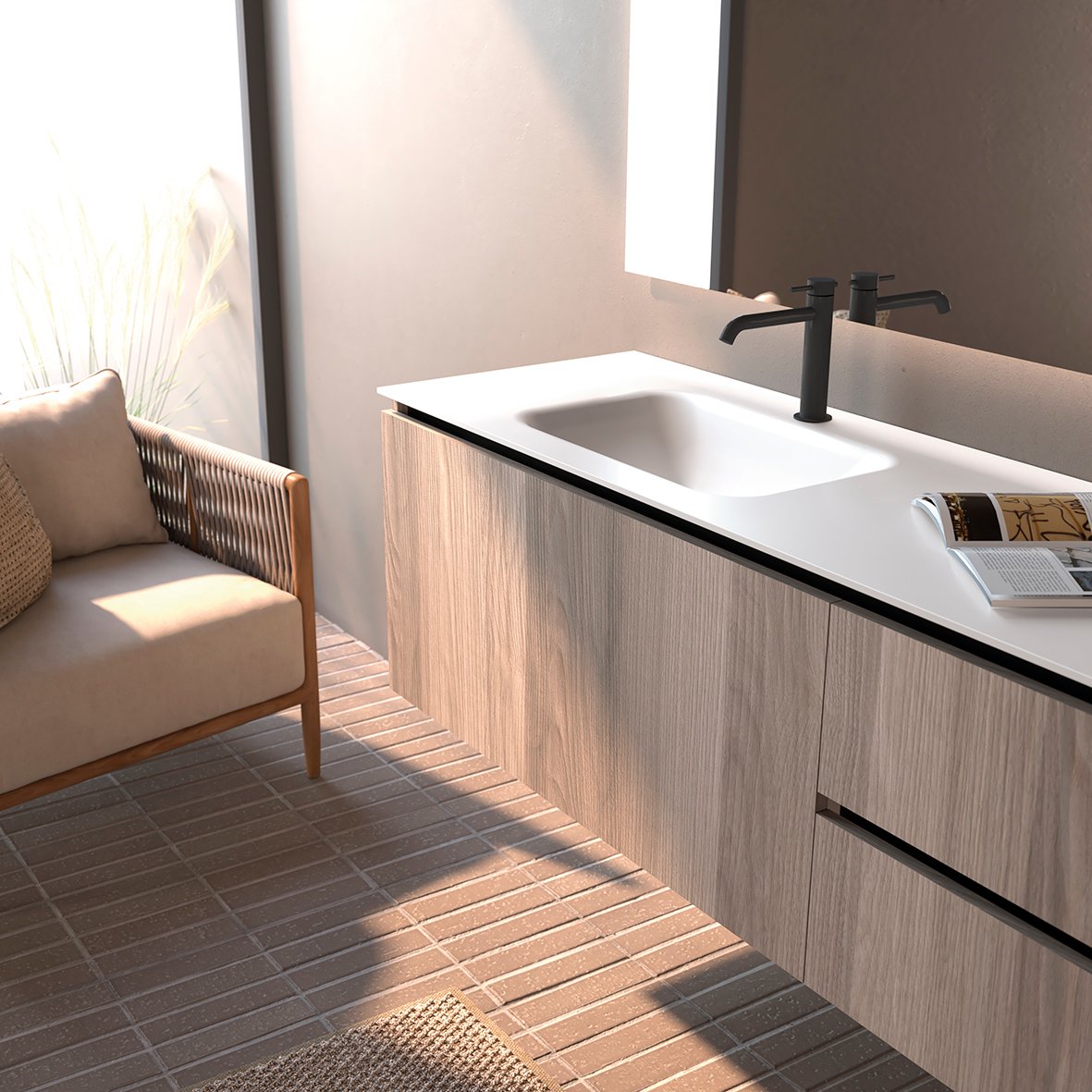 Aquesta col·lecció ofereix una rica paleta de materials, permetent escollir entre acabats laminats càlids (com el Siena o el Nogal Art) o la sofisticació dels lacats. A nivell pràctic, el moble es combina amb una encimera de resina blanca i permet escollir entre quatre models de lavabo. Pots configurar la pica en posició centrada, desplaçada a dreta o esquerra, o bé optar per una doble pica, afegint-hi la preparació per a aixetes murals o de repisa (al darrere).
