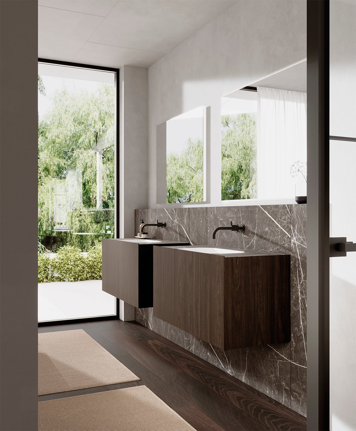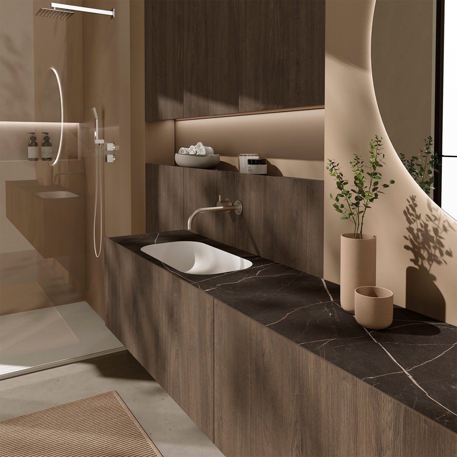 Per coronar aquestes composicions, Mapini aposta per les encimeres en HPL Compacte, un material insuperable per la seva extrema resistència a la humitat i a l’abrasió. Disponibles en elegants acabats que emulen el marbre, fustes càlides i el tacte tecnològic del material Fenix anti-empremtes, aquestes encimeres es poden combinar a la perfecció amb piques sota encimera (en el mateix HPL o en resina blanca), així com amb qualsevol model de lavabo de sobretaula.