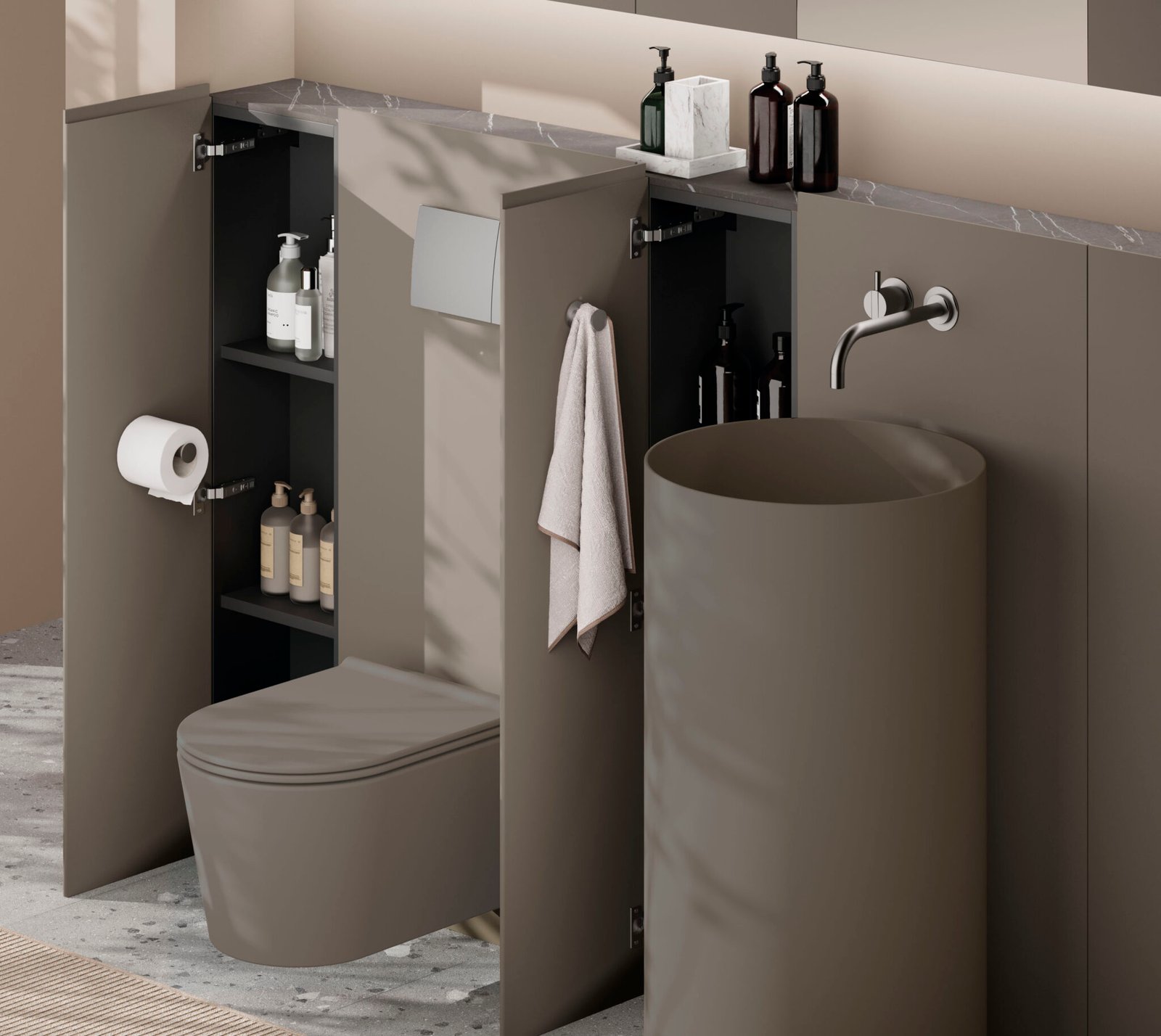La col·lecció Tuent Flat, dissenyada per Mapini a Mallorca, neix com el gran aliat per a projectes d’interiorisme i reformes àgils. La seva principal innovació és la capacitat d’integrar elements encastats directament en el moble i els armaris, com cisternes de vàter o aixetes de paret, permetent realitzar remodelacions amb molta més facilitat i sense necessitat de complexes obres de paleta. Aquesta característica no només escurça els temps d’execució, sinó que facilita enormement qualsevol futur manteniment o reparació.