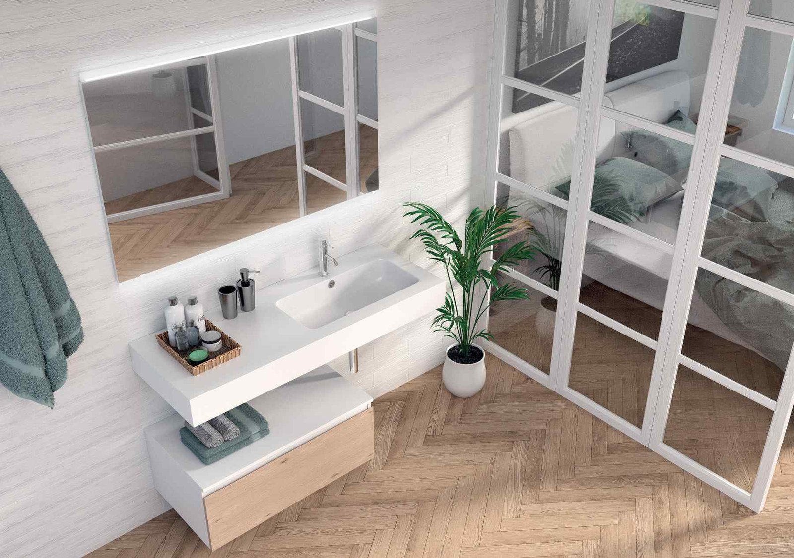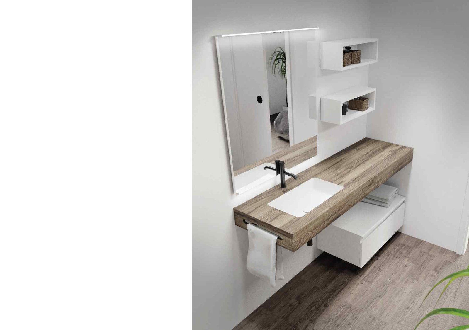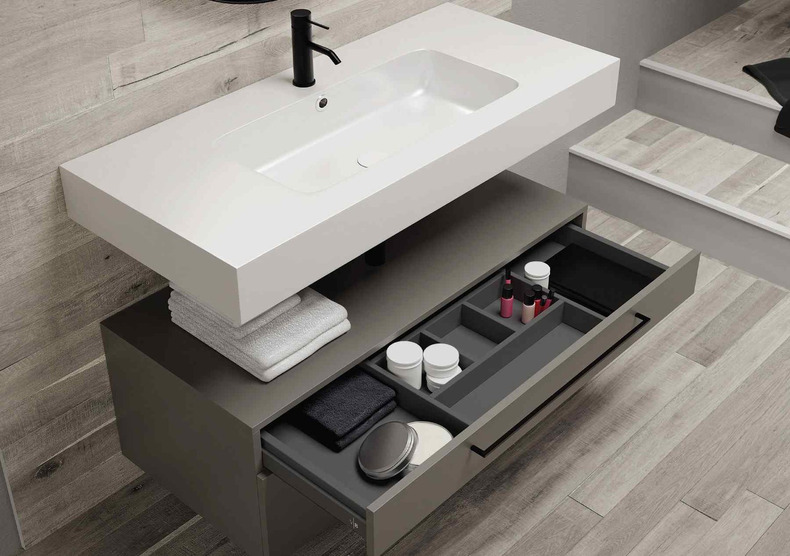La Sèrie UpDown 2 de VidreBany eleva el disseny modular a una nova dimensió de luxe i sofisticació. Mentre que la versió 1 juga amb la lleugeresa, l’UpDown 2 aposta per composicions amb més presència visual, ideals per a banys principals on es busca un impacte estètic potent. El sistema permet crear un joc de nivells on els mòduls de calaixos semblen lliscar sota l’encimera, generant espais de suport addicionals i una sensació de moviment única en el mobiliari de bany.