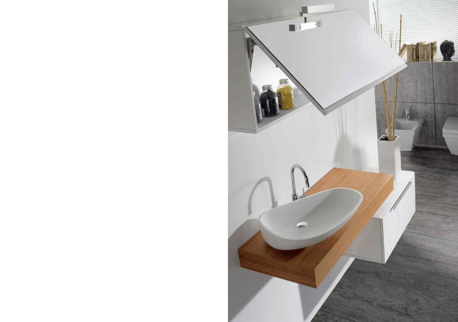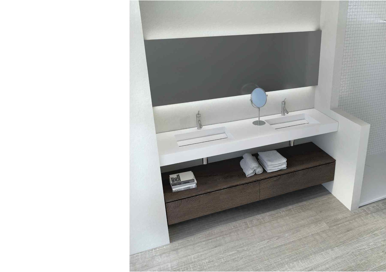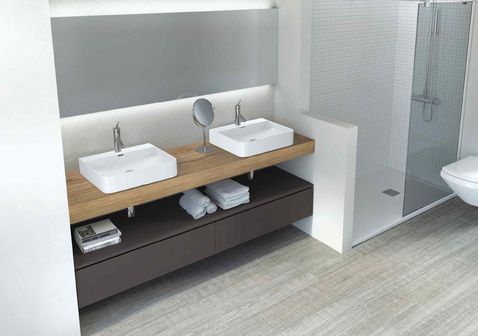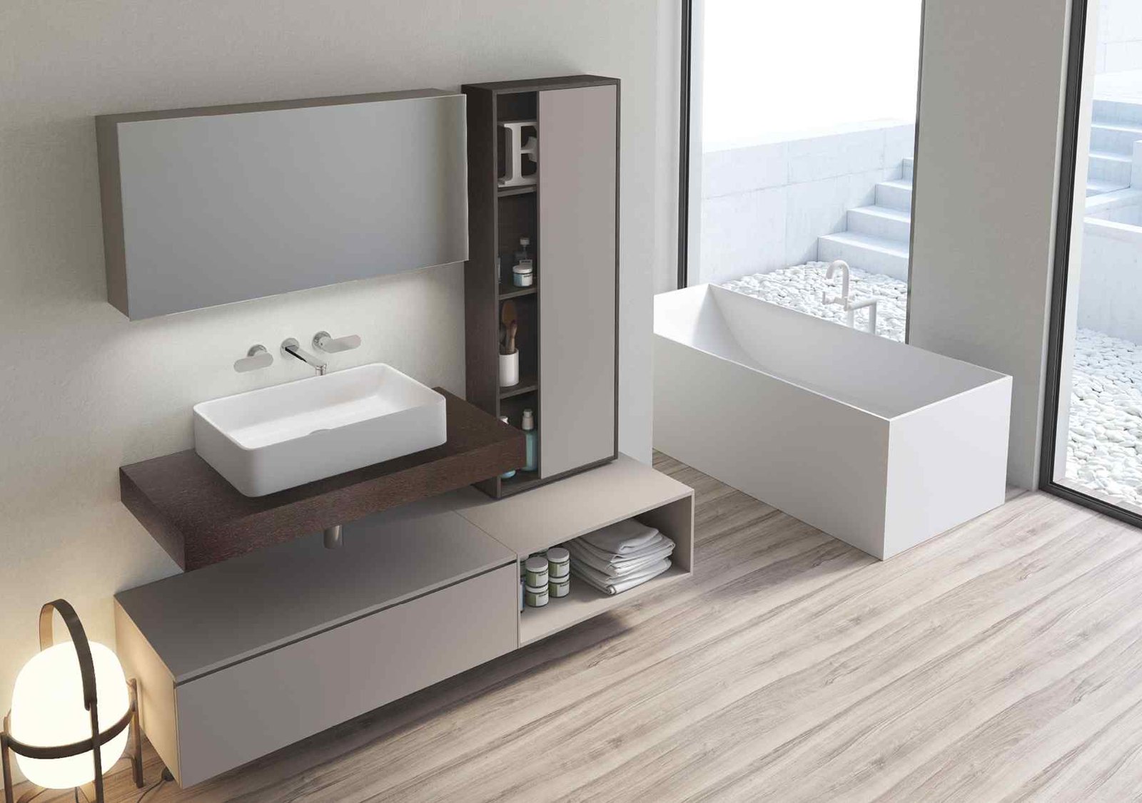La Sèrie UpDown 2 de VidreBany eleva el disseny modular a una nova dimensió de luxe i sofisticació. Mentre que la versió 1 juga amb la lleugeresa, l’UpDown 2 aposta per composicions amb més presència visual, ideals per a banys principals on es busca un impacte estètic potent. El sistema permet crear un joc de nivells on els mòduls de calaixos semblen lliscar sota l’encimera, generant espais de suport addicionals i una sensació de moviment única en el mobiliari de bany.