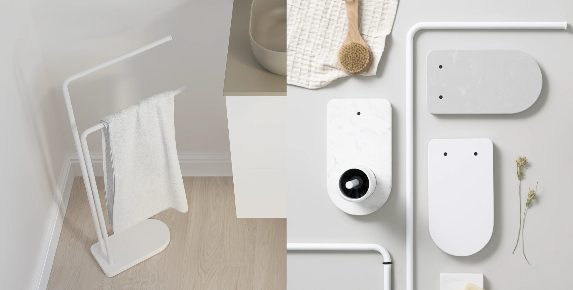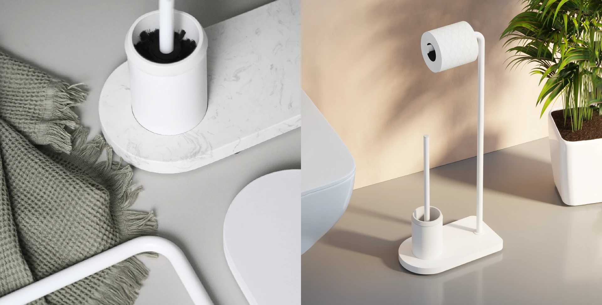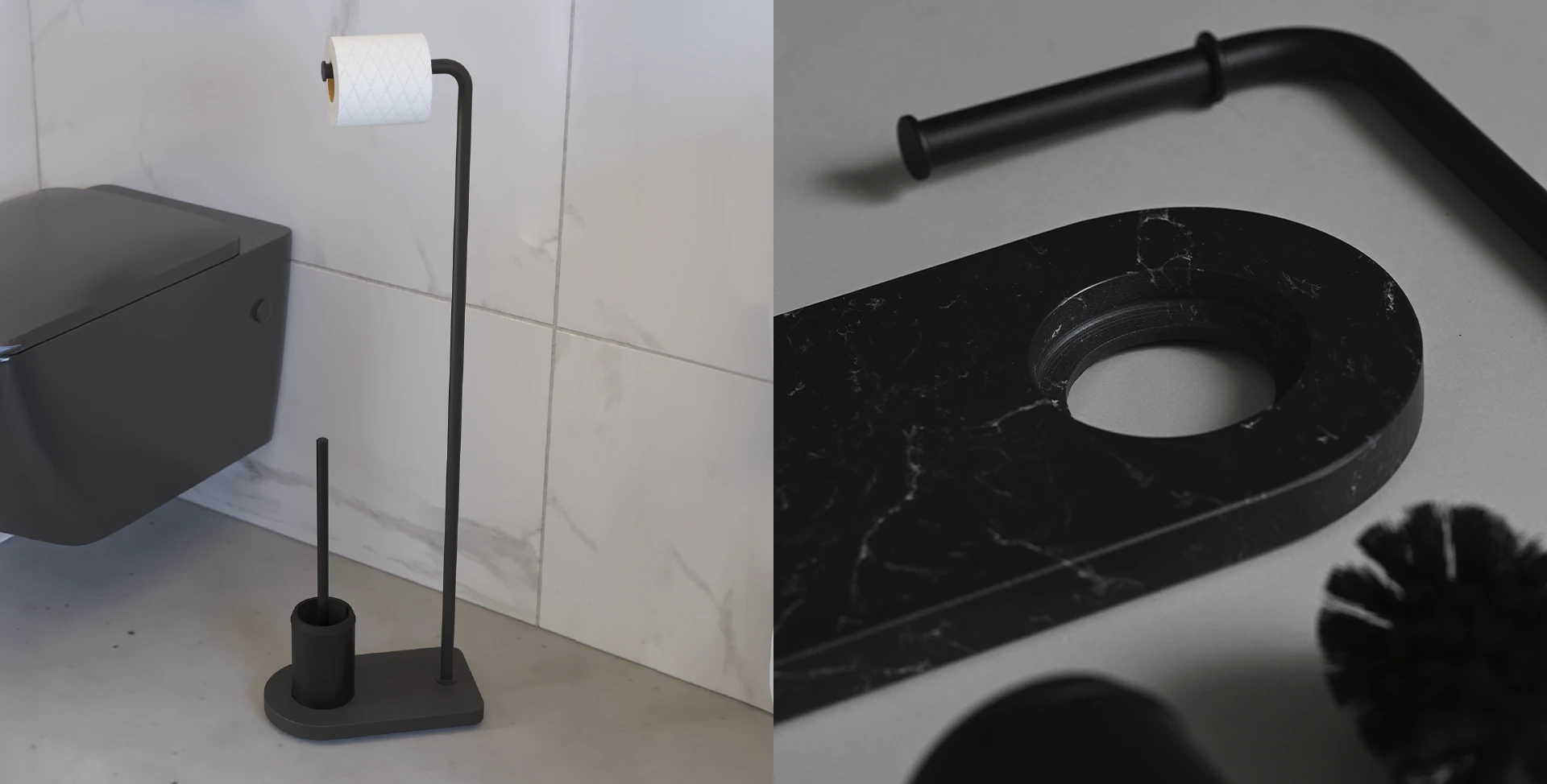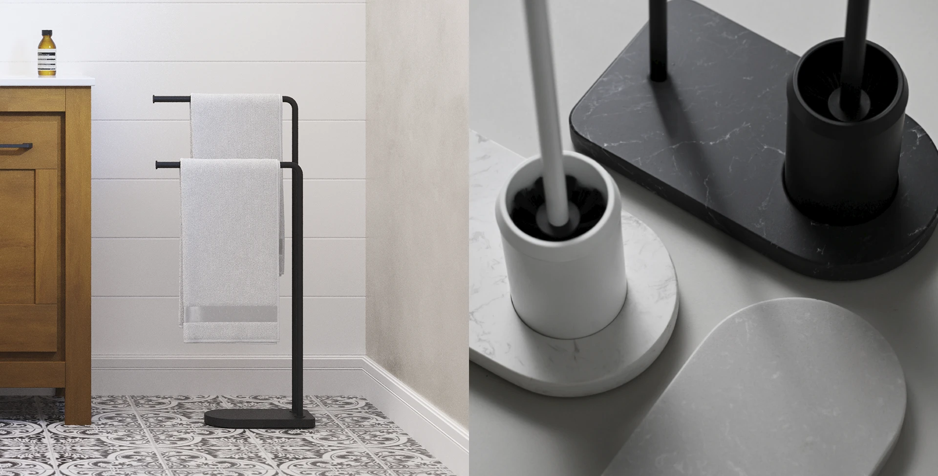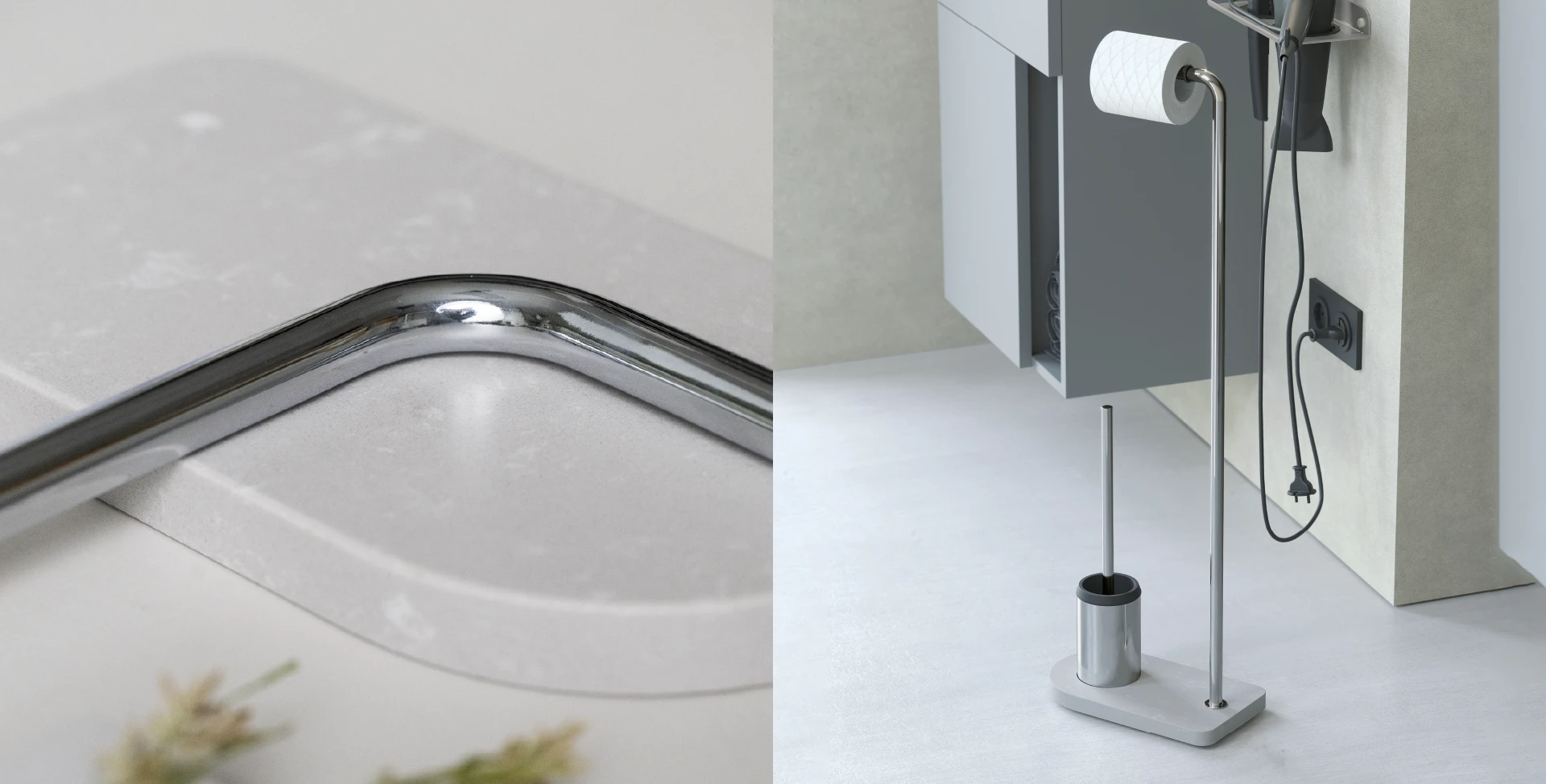 El gran avantatge del programa Nomad és la seva versatilitat espacial i la seva funcionalitat “zero instal·lació”. Com que no depenen de les parets, aquestes peces escultòriques es poden col·locar i moure lliurement per adaptar-se a la distribució de qualsevol bany, sent ideals per acompanyar banyeres exemptes o zones de lavabo diàfanes. Amb múltiples combinacions possibles entre els acabats de l’estructura (Blanc, Crom, Negre) i les textures de la seva base de pedra (com l’imponent efecte marbre Calacatta o l’elegant Marquina), Nomad permet crear autèntiques peces de disseny personalitzades.