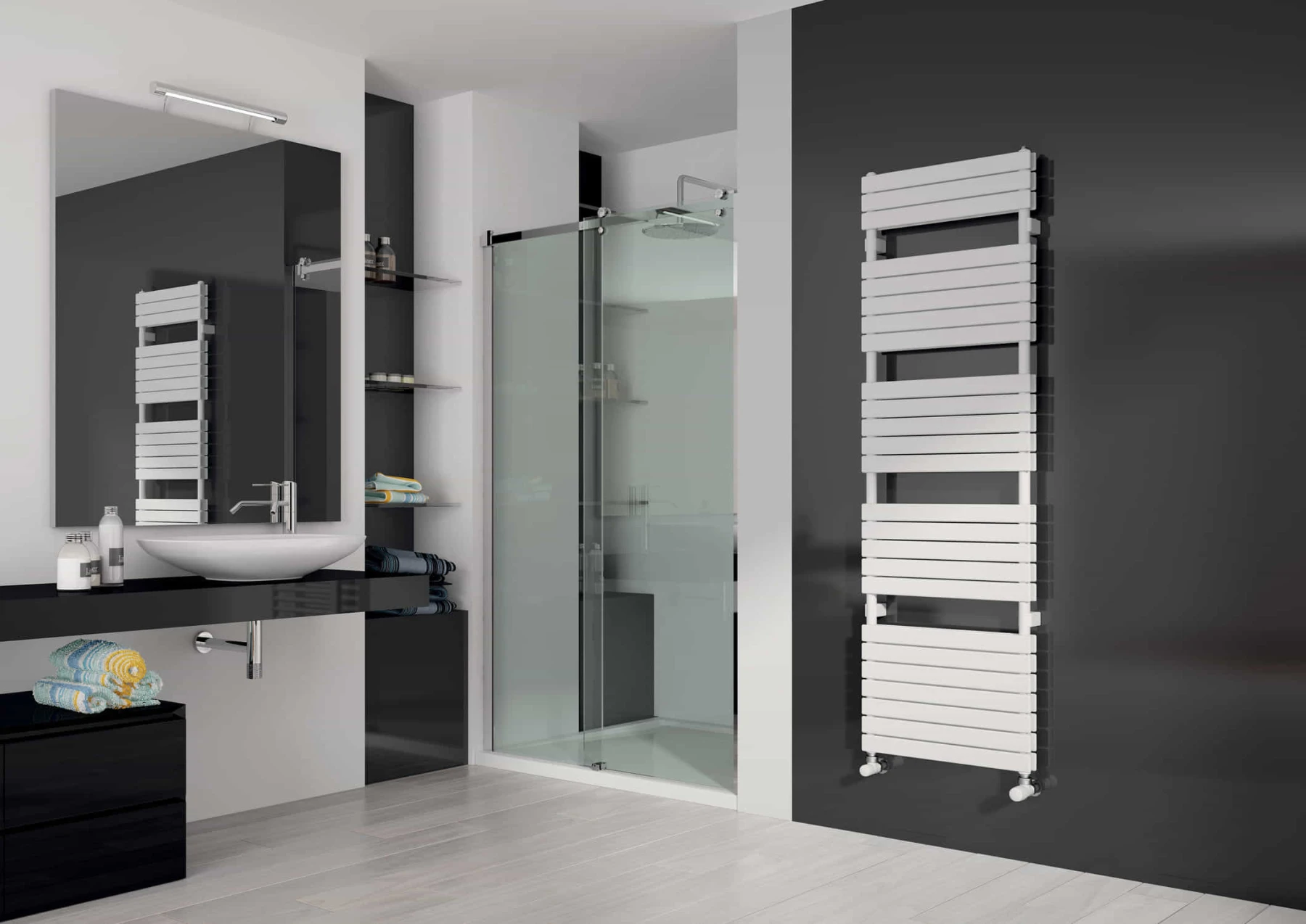 La doble potència de la sèrie Xilo manté el disseny de tubs plans per a banys que requereixen calefacció intensiva sense perdre la línia minimalista.