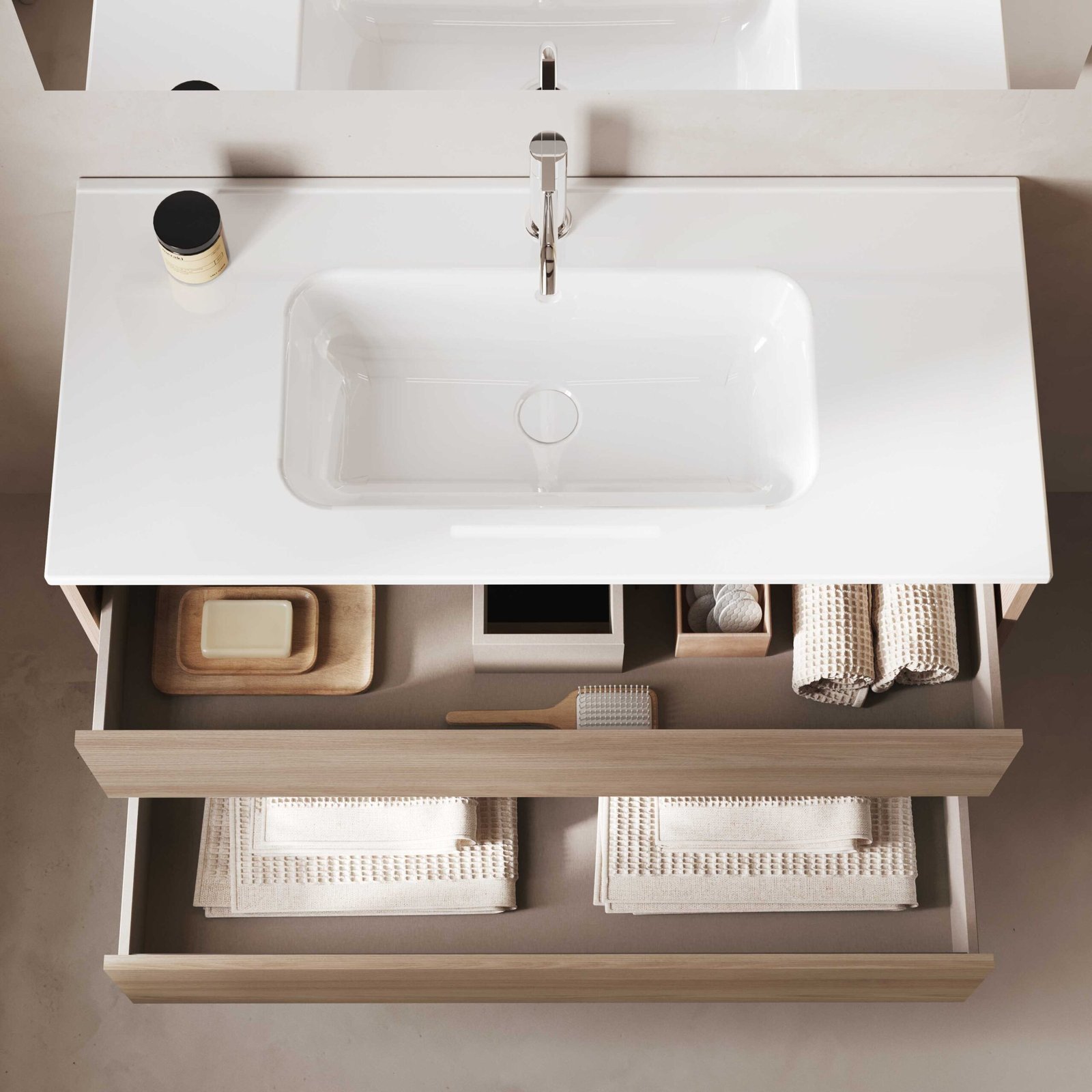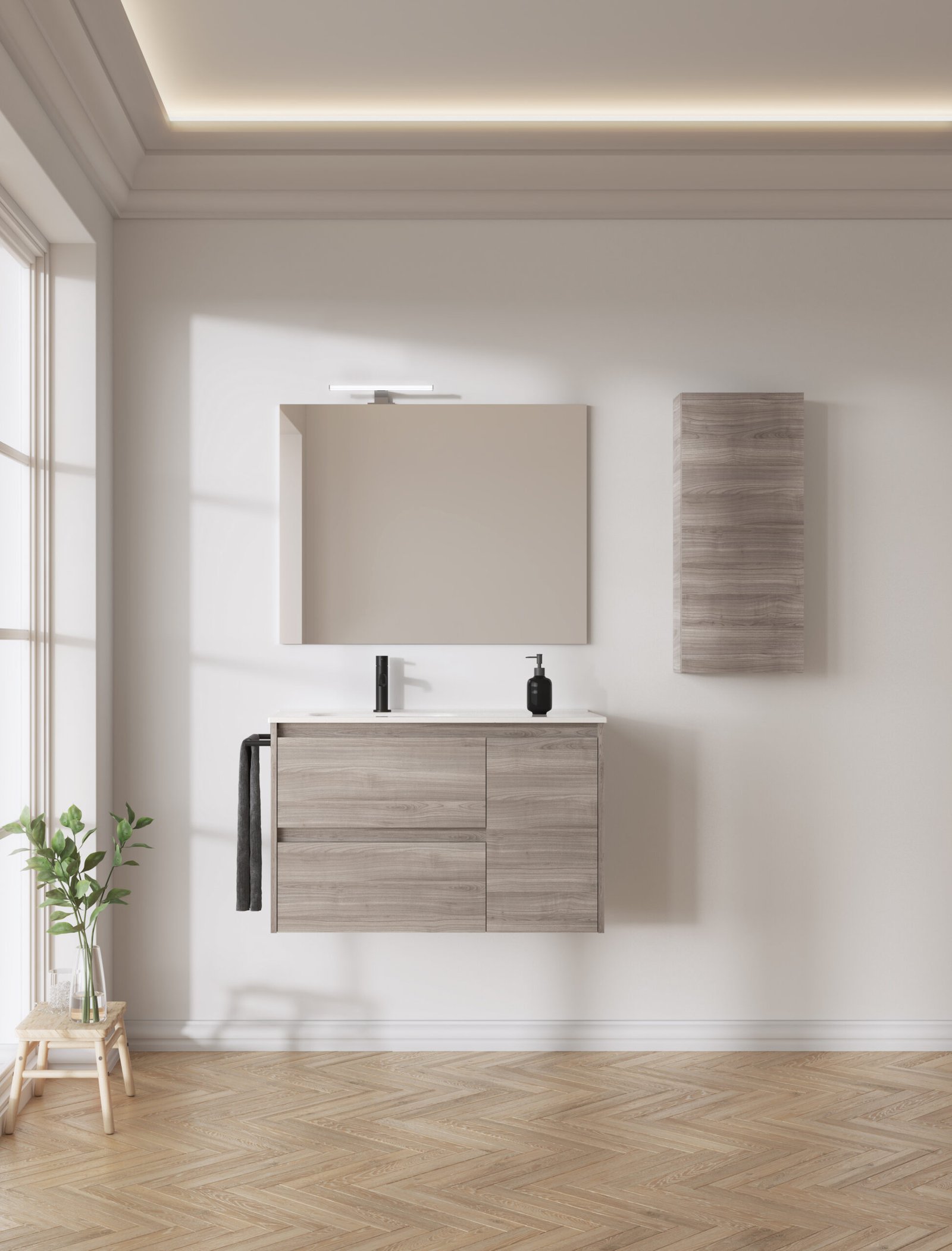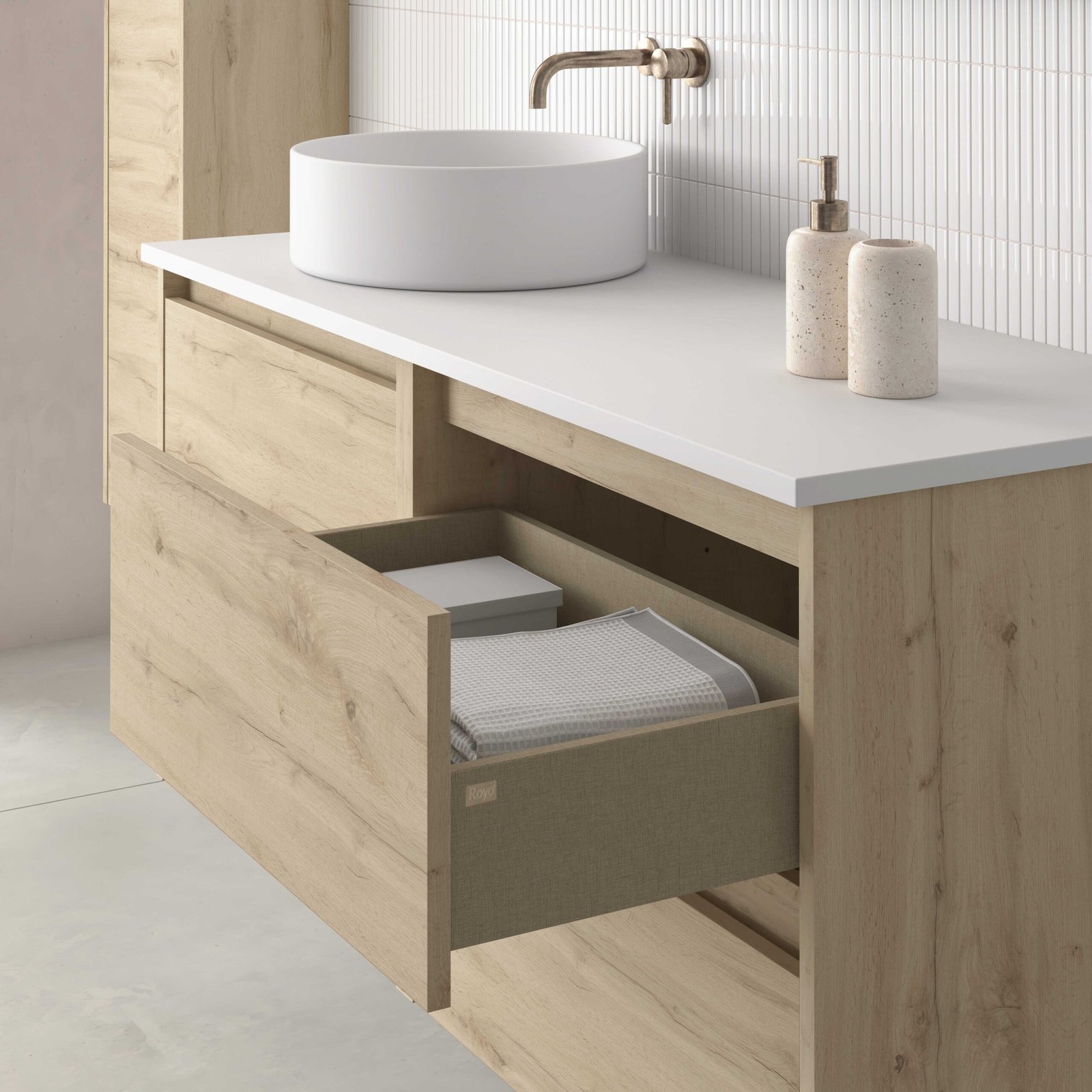 Una de les grans virtuts de la família Sansa és la seva extraordinària amplitud de gamma i versatilitat estructural. Ofereix una llibertat total de configuració per adaptar-se al teu ritme de vida: pots triar entre models suspesos o a terra, i estructures basades només en calaixos, només portes, o una pràctica combinació de tots dos (ideal per desar tovalloles o flascons d’alçada). Al seu interior, la gran capacitat es maximitza amb un elegant revestiment en Tèxtil Gris i l’eficiència de les guies Hettich, garantint un tancament suau i silenciós.