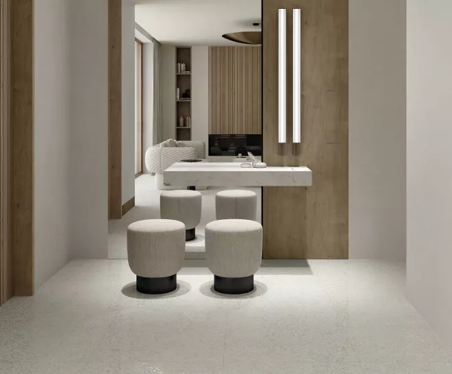 L’essència de l’arquitectura industrial moderna per crear espais neutres i d’àmplia continuïtat visual. Aporta un caràcter sòlid i minimalista amb una superfície ultraresistent.