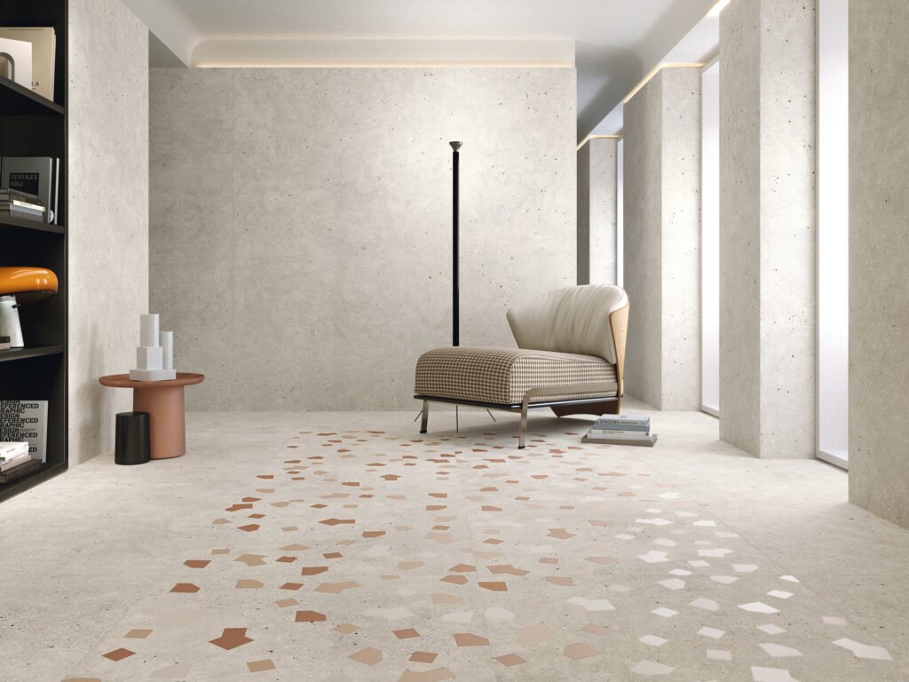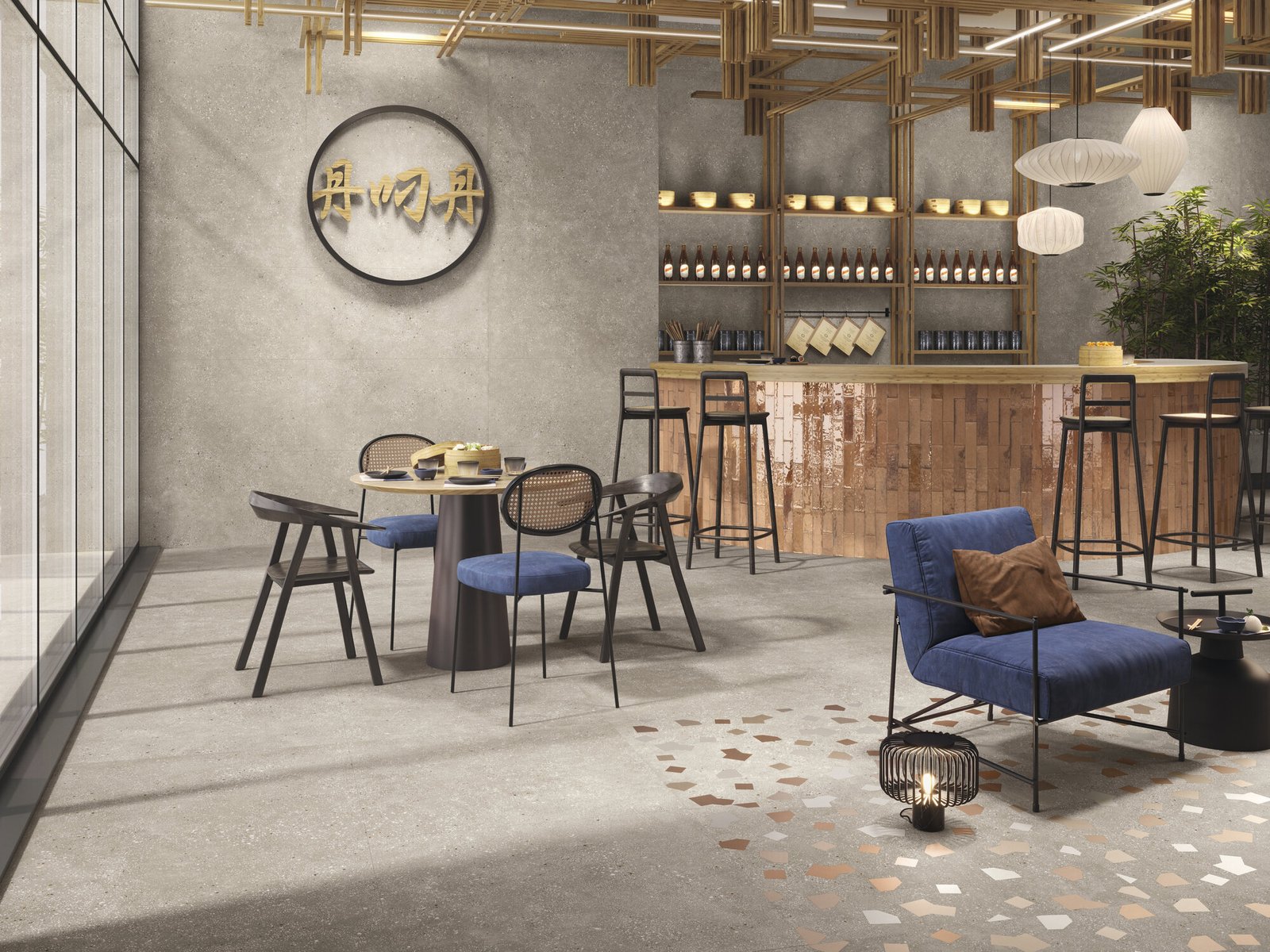 No és un ciment estàtic només per a terra. D’una banda, permet una solució continuada amb grans planxes, però s’expandeix incloent nous models trencadors en revestiments de paret (Shape, Contract, Fiori). Aquests relleus de fons urbà permeten a l’arquitecte trencar la sobrietat en parets frontals sense abandonar l’estil loft luxós predominant en tot el projecte.