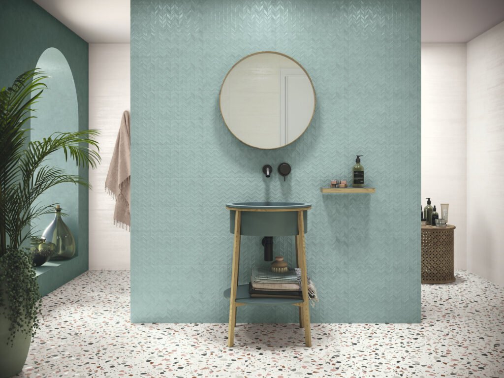S’ha elaborat expressament com a revestiment en format 20×50 cm, sent molt àgil d’instal·lar. El disseny juga incorporant gràfiques de relleu (Decor Rain, Decor Aka) i línies purament Pop. Aquesta combinació actualitza sense contemplacions tota la idea del *terratzo natural* en parets d’autor que desvelen una capa decorativa molt fresca i optimista.