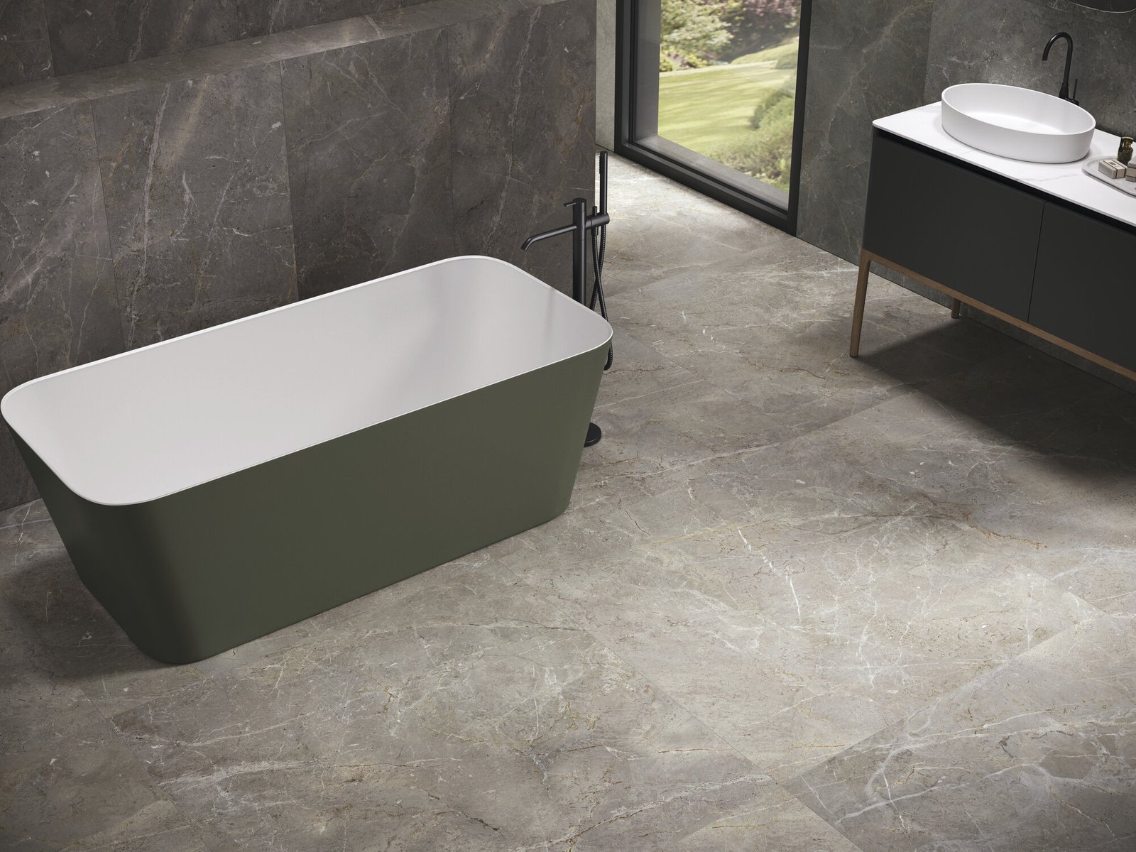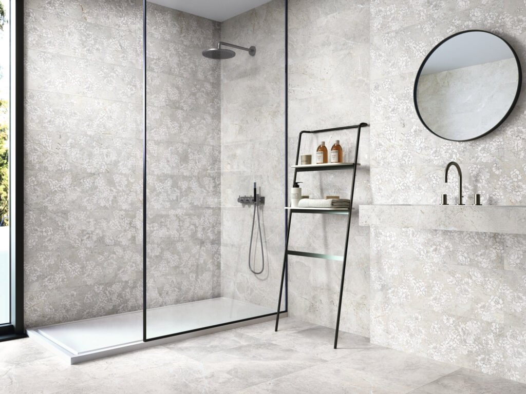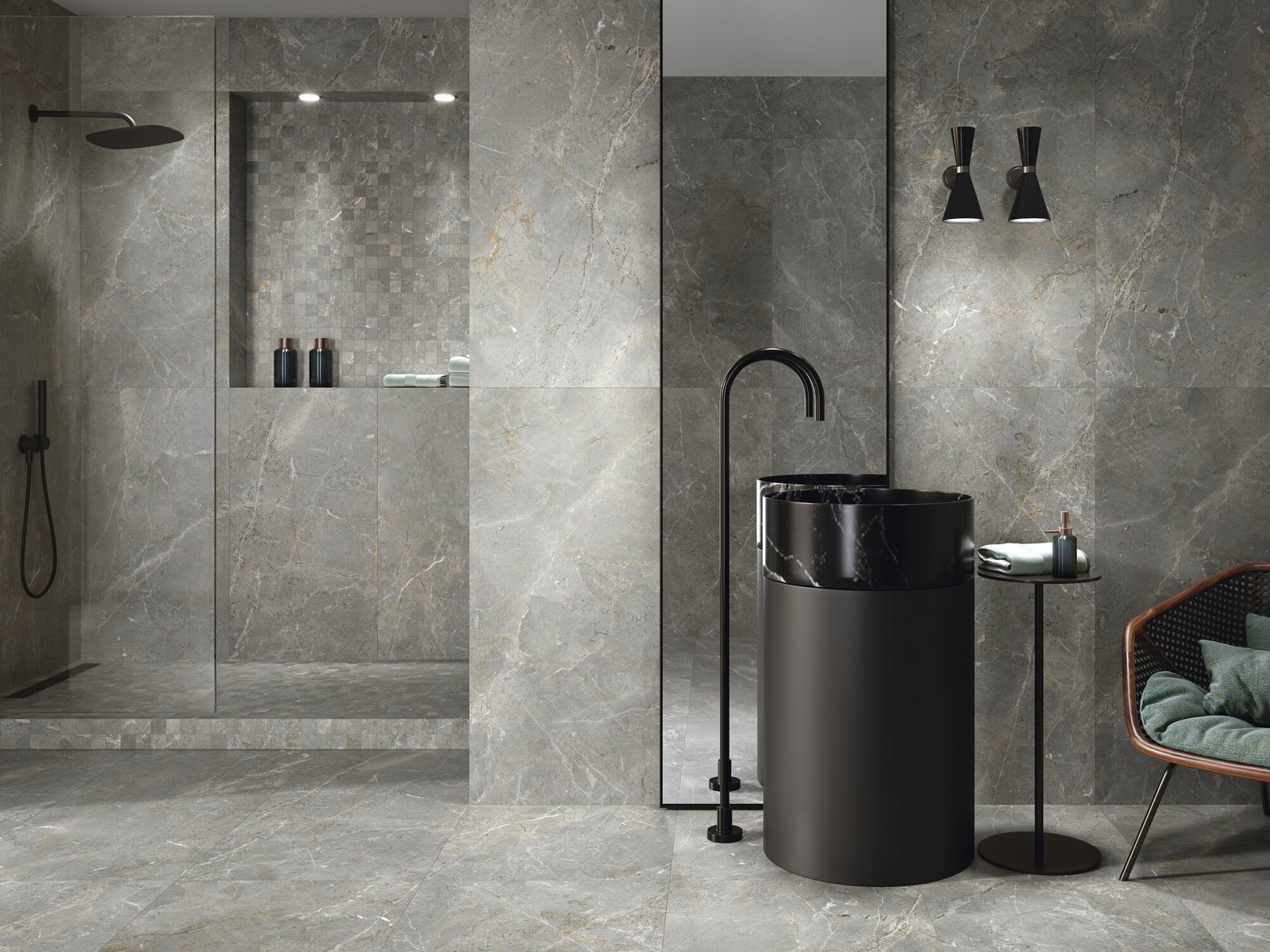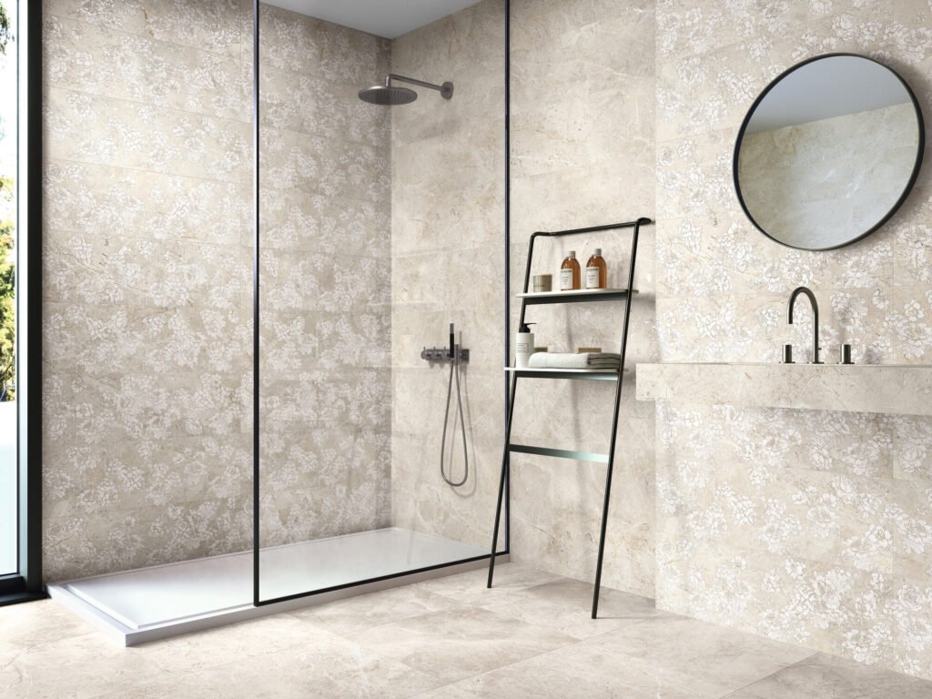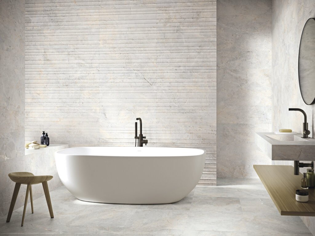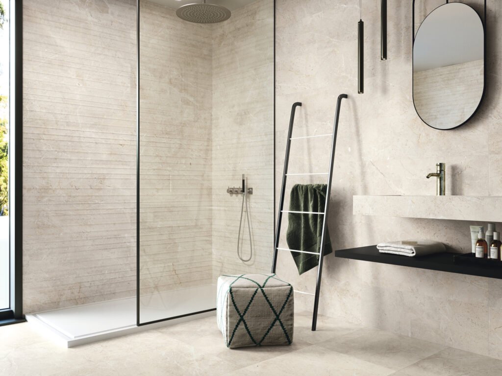 Material i Inspiració: Gres porcellànic inspirat en exòtic marbre calcari d’Àsia Central amb vetes fines incrustades en relleu de pedra base.