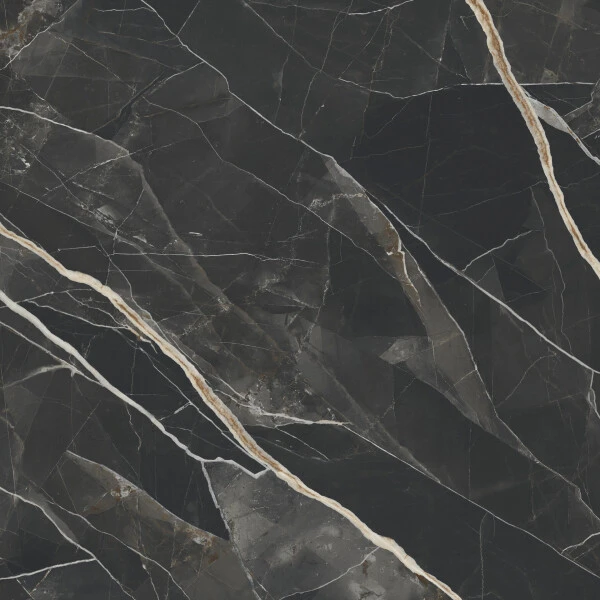 Inspirada en l’exclusivitat i l’aura de misteri dels marbres africans més preuats, aquesta proposta ceràmica destaca per la seva innegable força dramàtica. Sobre un fons negre d’una profunditat abismal, s’hi dibuixen sinuoses vetes daurades i blanques que capten i guien la mirada, esdevenint el llenç ideal per a espais que busquen una estètica de luxe absolut, caràcter i màxima sofisticació.