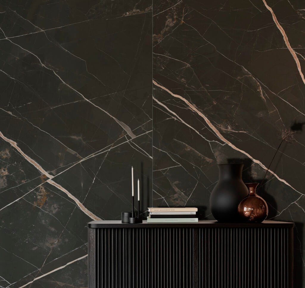 Gres porcellànic d’alta gamma i pedra sinteritzada (Coverlam) que reprodueix la força visual i el luxe del marbre fosc amb vetes en contrast.