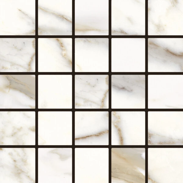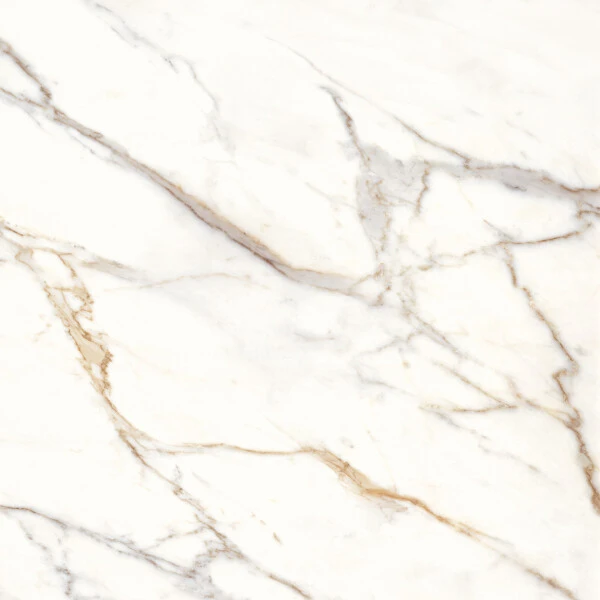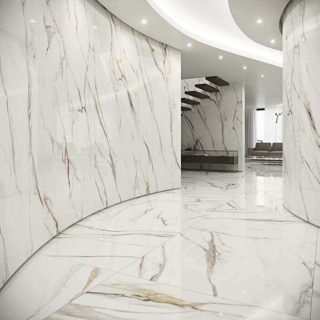 Gres porcellànic d’alta gamma i pedra sinteritzada (Coverlam) que reprodueix la lluminositat i el luxe atemporal del marbre blanc amb vetes daurades.