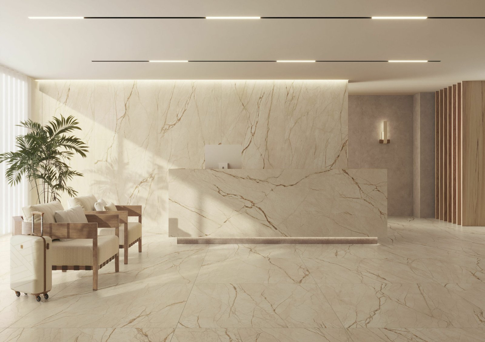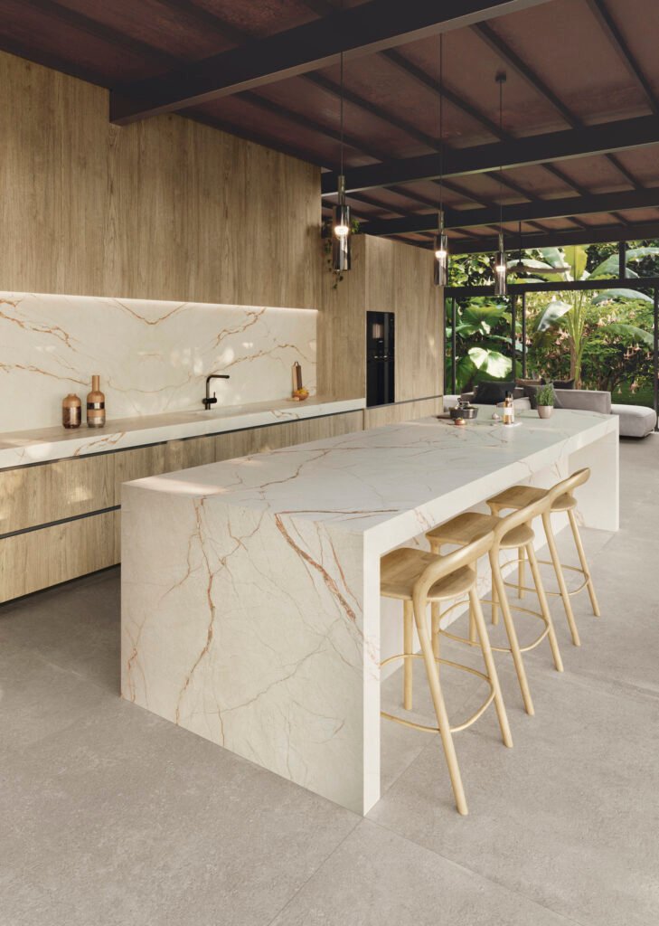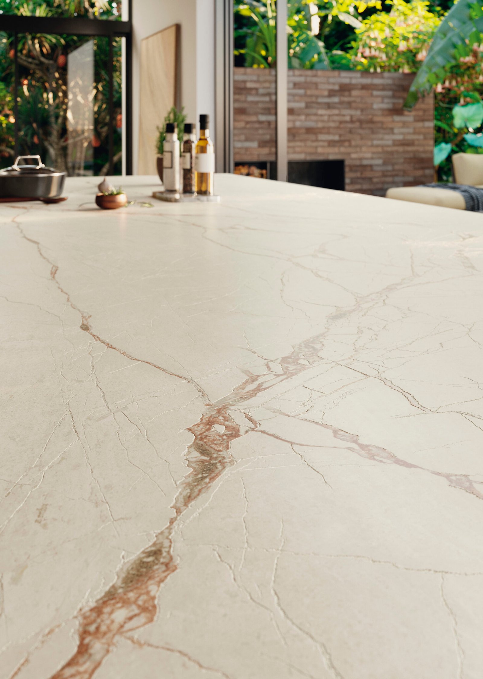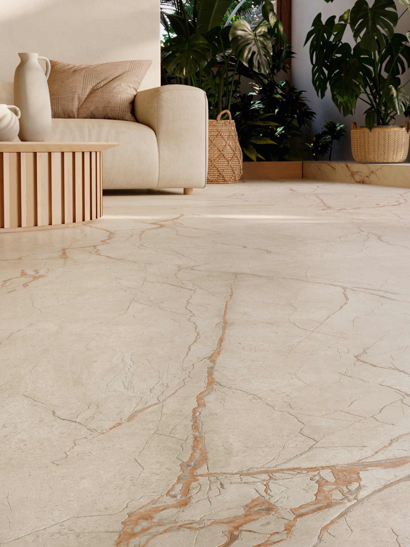 Gres porcellànic d’alta gamma i pedra sinteritzada (Coverlam i Coverlam Top) que reprodueix la bellesa orgànica i els matisos càlids del marbre natural.