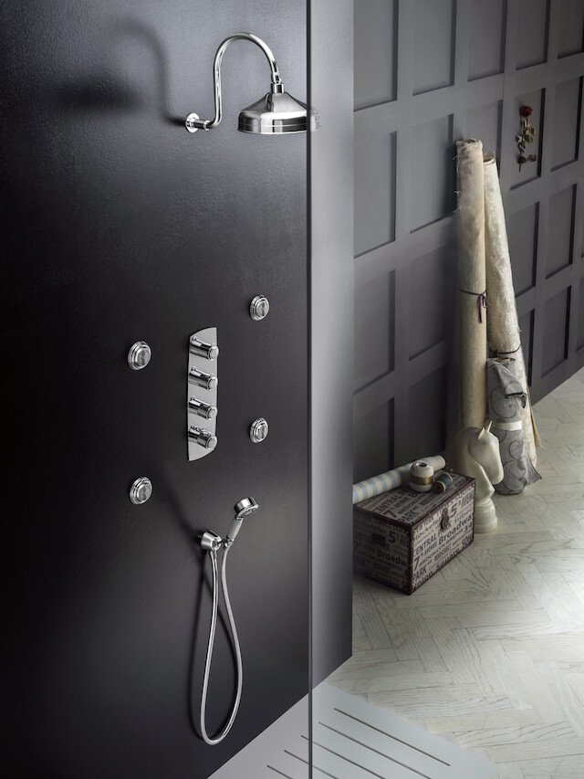 • Zona Dutxa: Grups exteriors de dutxa clàssics, conjunts encastats, barres lliscants d’estil retro i majestuosos ruixadors de pluja tradicionals.